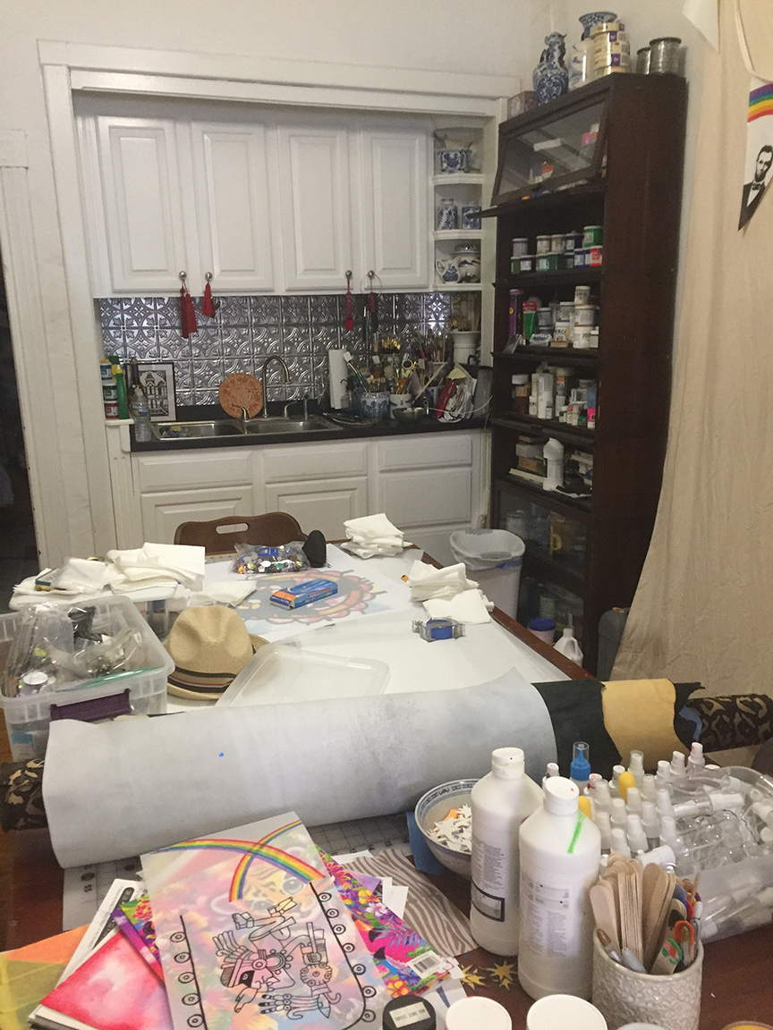 Truthfully it’s that I never have enough time. I have dedicated days for my studio practice but life happens and responsibilities and the things you have to do to be a citizen of the world. So often it just feels like there’s not enough time to physically be here, even though it is my favorite thing and I try to do it as much as possible. It’s nice to work at home, it takes away the barriers. If I have 45 minutes I can just pop in here and do something. I can sneak in laundry or dinner when I am waiting for an area of paint to dry, there’s a nice back and forth.
