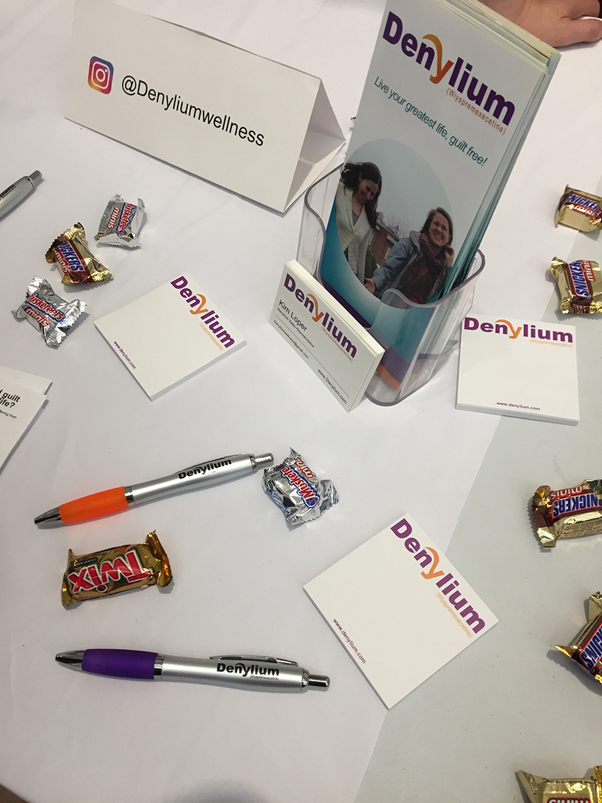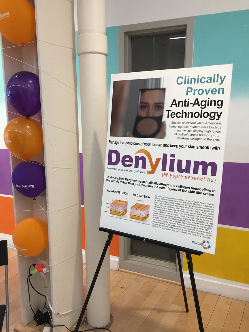 Within the entrance of the building, viewers are enticed by what looks to be a job fair or a table to advertise products at a conference or trade show. Community Arts MFA candidate Kim Loper master-minded the eerily convincing campaign for the pseudo-drug Denylium.