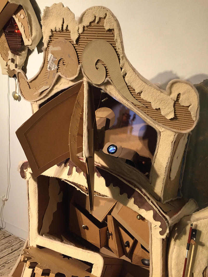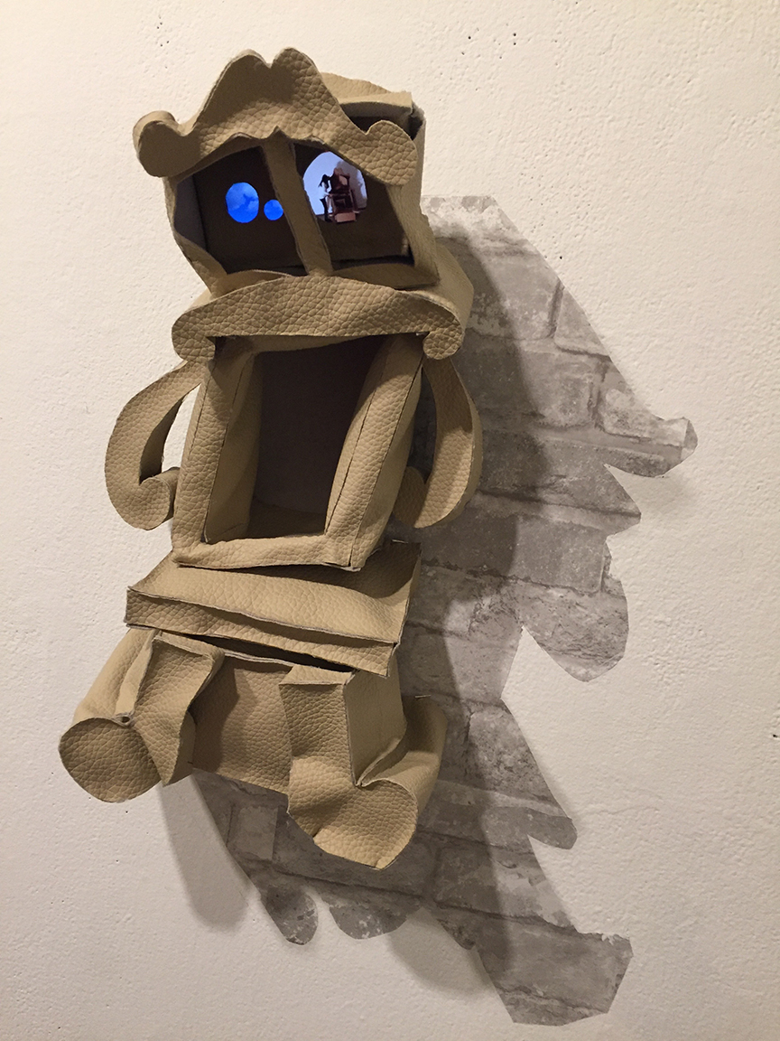 One of my favorite pieces of the night was “Why should he console so many others when I want him only for myself” by Jihyun Vania Oh, Mount Royal School of Art. The mixed media piece uses Arduino sensors, video, and conventional sculptural methods to create a bizarre Disney gone wrong melting bureau. Each portion of the piece has a fake shadow, videos, and motion. This is another piece that should be seen in person to fully appreciate the kinetics and construction.