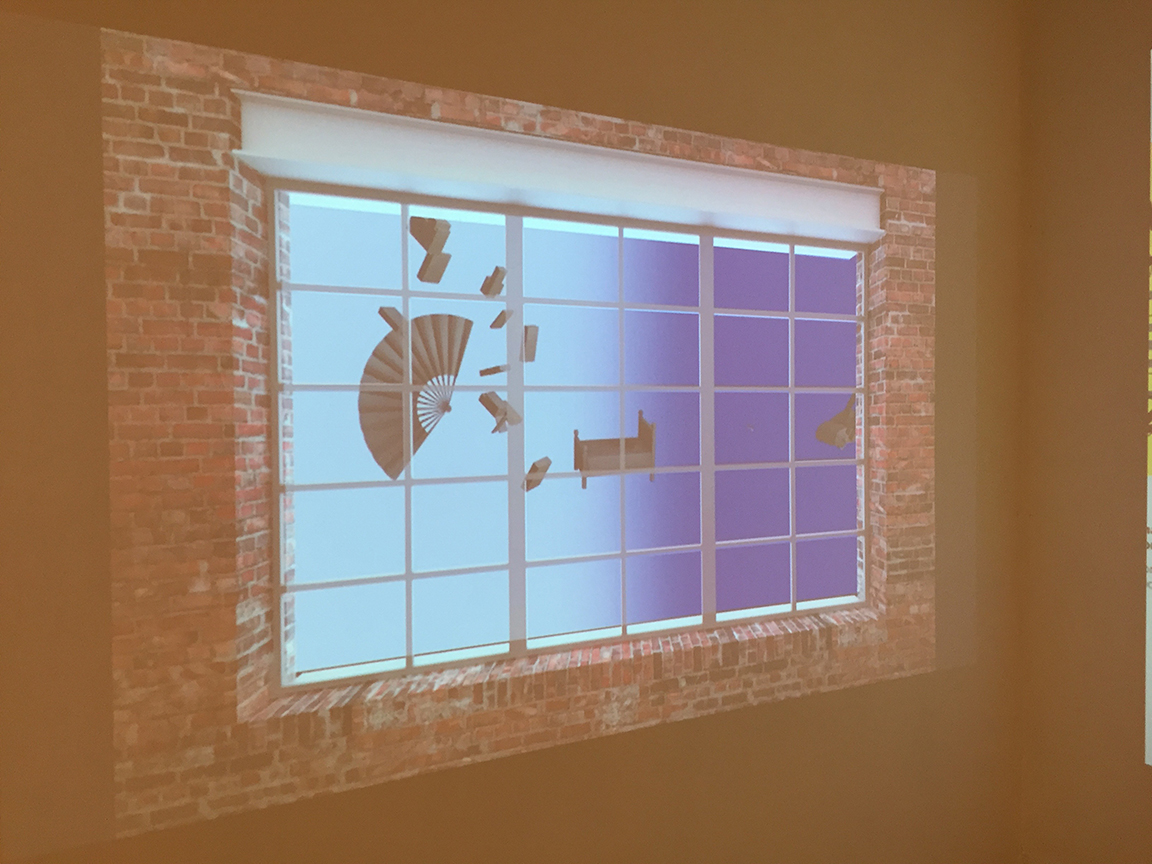 Qin’s works are interactive and reactive, projecting visual memories of the motions you make in front of her space. The virtual spaces become very meta – also referencing the space you are in while viewing. One piece shows the window to the Fox building with objects flying by and the other includes not only the viewer’s body, but also the artwork (of another candidate) that is in the adjoining gallery space.