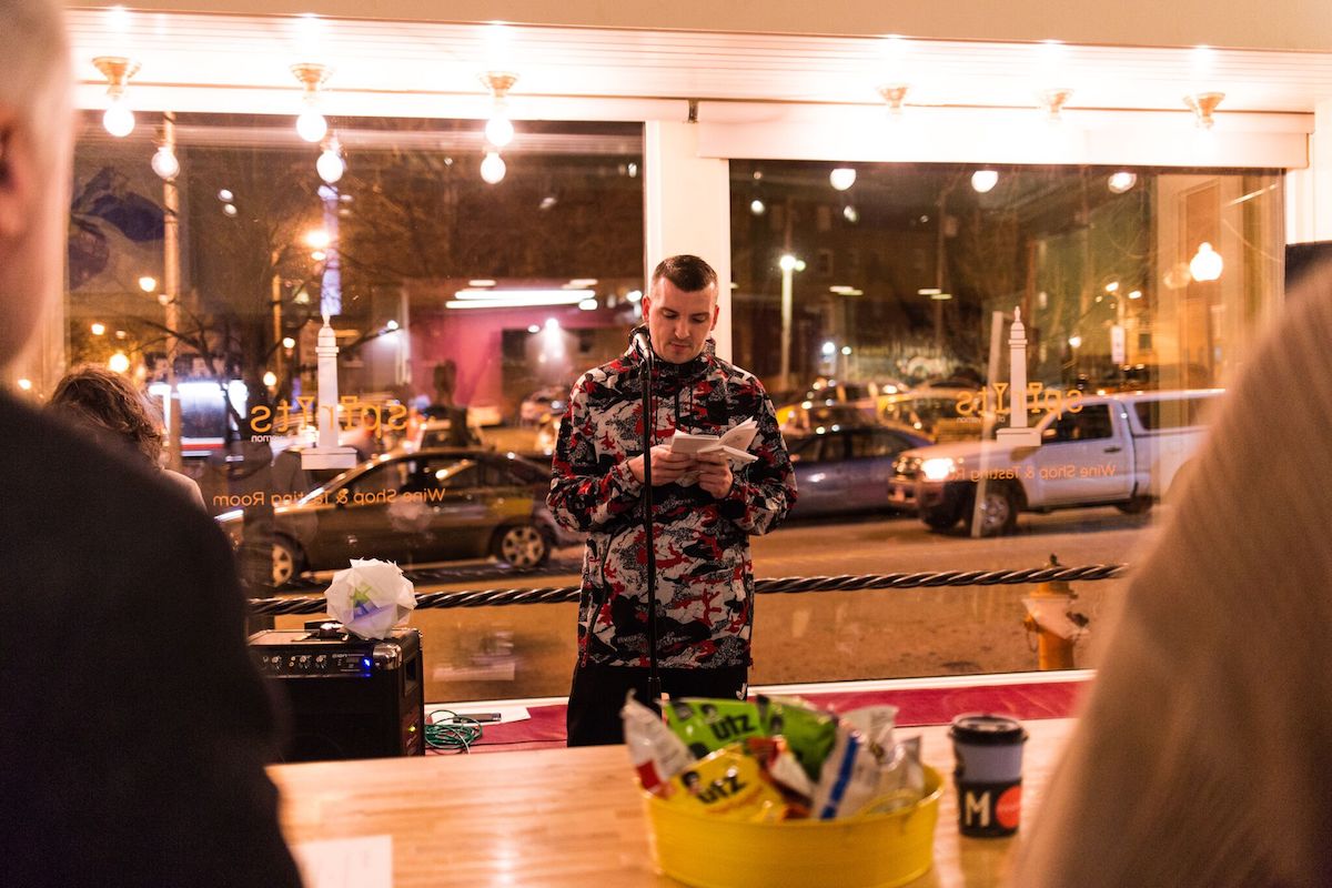 During the Anti-Trump protests back in the fall, Doyle was called into work on Thursday, November 10, to police the protests. He was supposed to be reading his poem that evening for the Amplified Cactus prompt “Can I Thrive in a Pathological Environment.” Instead, he handed over his work to Feilds, who went on to read his poem in his place. Once the last performance ended and the artists together stood up at the front to receive their applause, hundreds of protesters marched past Spirits of Mt. Vernon. Vicky swung open the doors while everyone poured out into the streets shouting “Can we thrive in a pathological environment?”