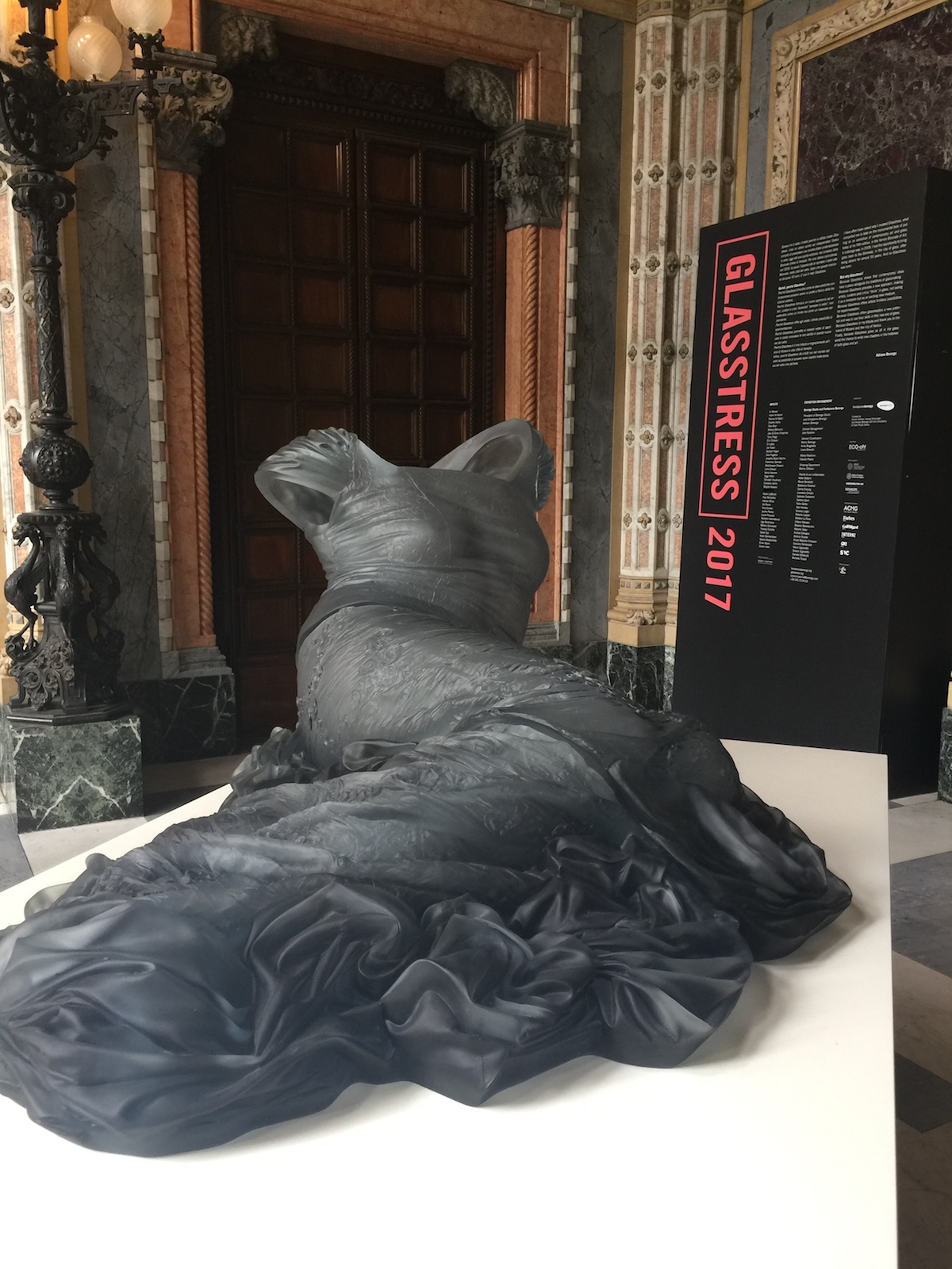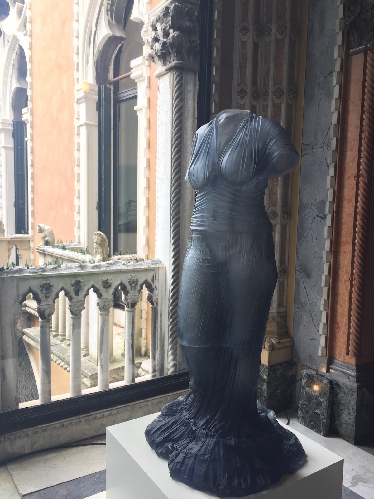 Once inside the grand palazzo, an opulent setting where walls are inlaid with patterned marble and festooned with giant chandeliers, Karen Lamonte’s luminous goddess figures serve as a much more subtle introduction to the exhibit. Regal and semi-transparent, each gown renders detailed folds of cloth in loving detail. Like ancient Roman statues, each is headless, armless, and human-sized, with each of three gowned torsos offering a stunning array of intricate detail.
