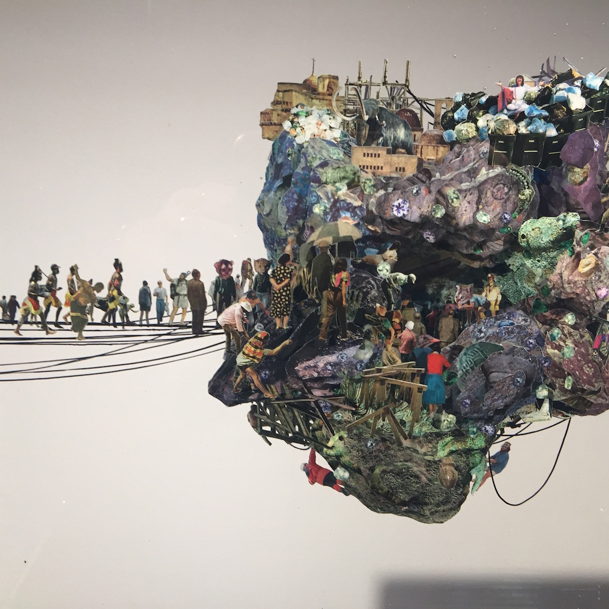 Dustin Yellin’s dioramas appear to be encased in square chunks of ice displayed on top of metal bases. They offer a cascade of minute narrative details that charm like a Wes Anderson film, while a striated side view offers clues to its laborious and immaculate construction in layers. Yellin’s scenarios are brimming with theatrical drama, conflict, and activity, inviting the viewer to piece their stories together like a detective. The yummy glass surface gleams and offers a preciousness and also a distinctive weight to each piece.