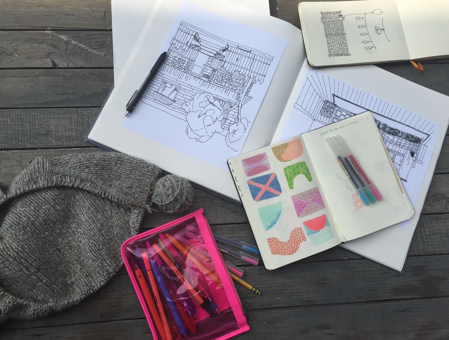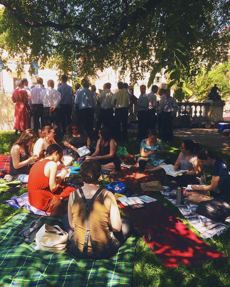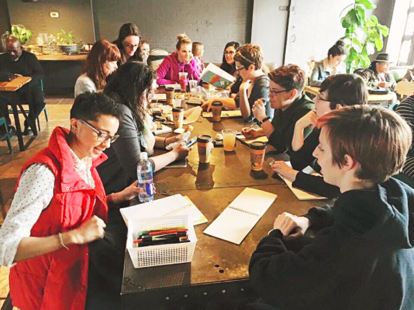 RB: Basically, we show up ten minutes early, I spread my drawing supplies to make it obvious something’s happening, and post on social media that we’re there. People slowly show up with all different supplies (not just drawing, but crafting too). It usually lasts three hours, until we all have to pee or get hungry.