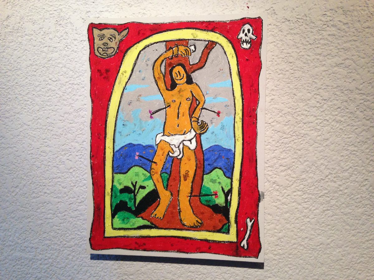 In “Ella”, a nun poses for a “sexy” selfie in a graffitied bathroom, lifting up her habit to reveal high heels, while an Olmec statue lurks in the corner, grimacing. “St. Sebastian Selfie” is exactly what it sounds like. The famously homoerotic icon of martyrdom is viewed smiling, smartphone in hand, through a mirror flanked by laughing masks that respectively appear to depict Xolotl and Mictlantecuhtli—two Aztec gods associated with death.