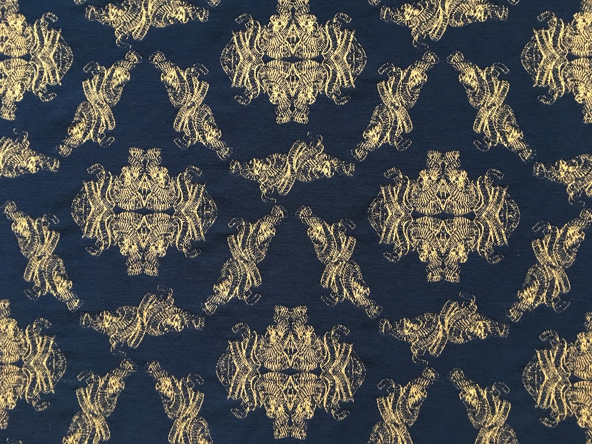 Intrigued by what she saw, Couwenberg executed a series of intricate line drawings, and then began to produce more substantial works that drew on her experience as a fiber artist and that also alluded to the rich artistic traditions of her native Holland. At a textile laboratory, she designed a series of damask panels whose primary motifs are derived from piscine details, but whose marginal designs recall the lacework of Zeeland, where Couwenberg spent time as a child. Her use of damask, moreover, was apparently inspired by the black painted fabric in a Frans Hals portrait owned by the BMA: a fabric that she then rendered in a deep blue reminiscent of the traditional ceramics of Delft. The four exhibited textiles, then, are dense mash-ups of biological, art historical, and autobiographical source materials.