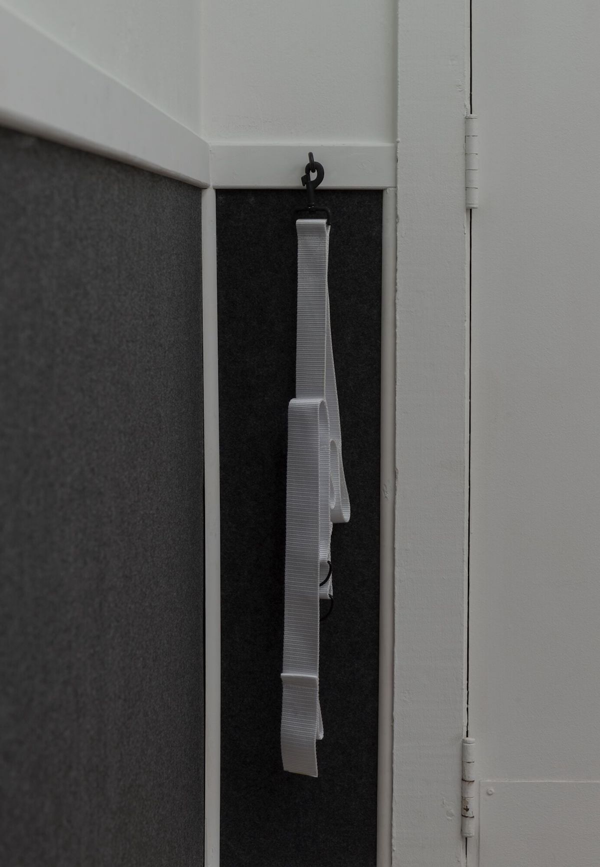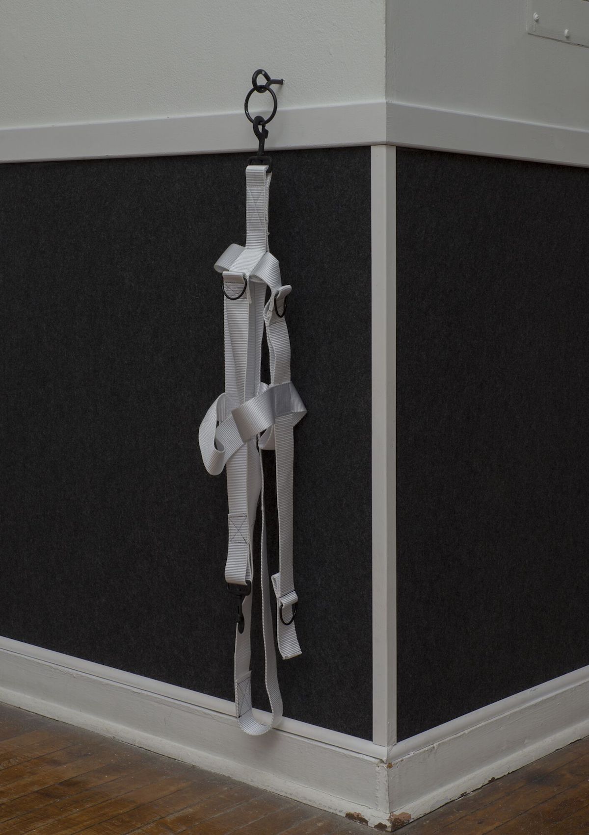 In each mirror, the white drawings are difficult to read. You have to come in close to see yourself and the room reflected in it, to decode it. These mirrors implicate you as a participant in this fantasy, where it’s unclear if bondage is the starting point (a gay youth trapped in a repressive church), end point (an adult interested in such practices), or a symbol for the entire exhibit.