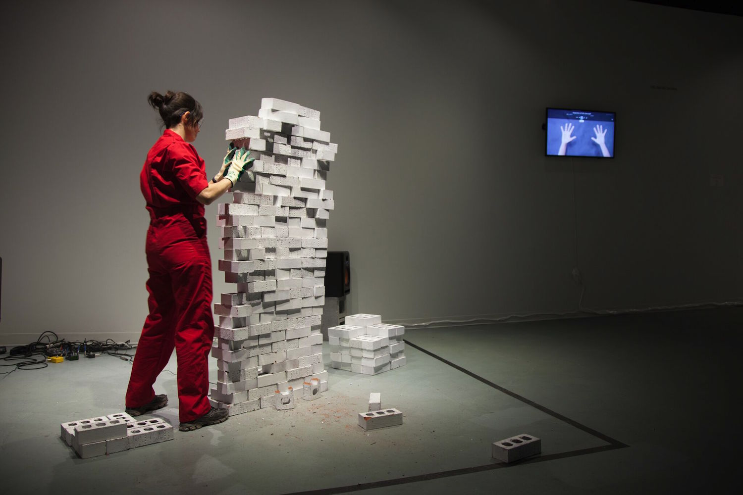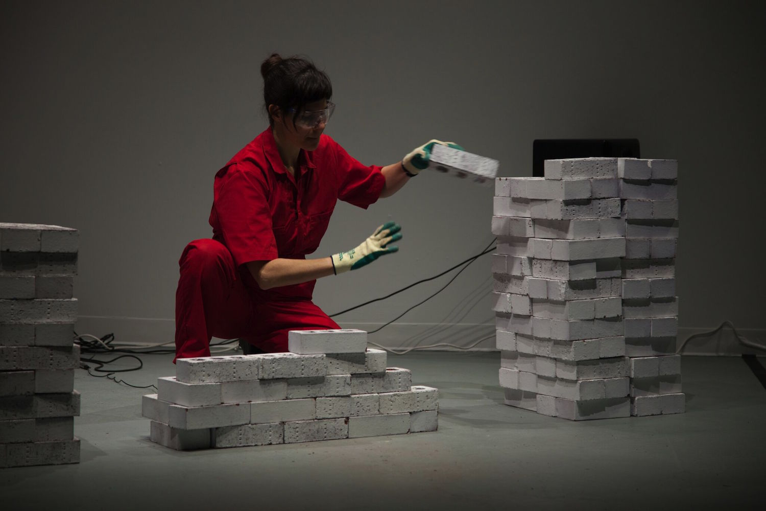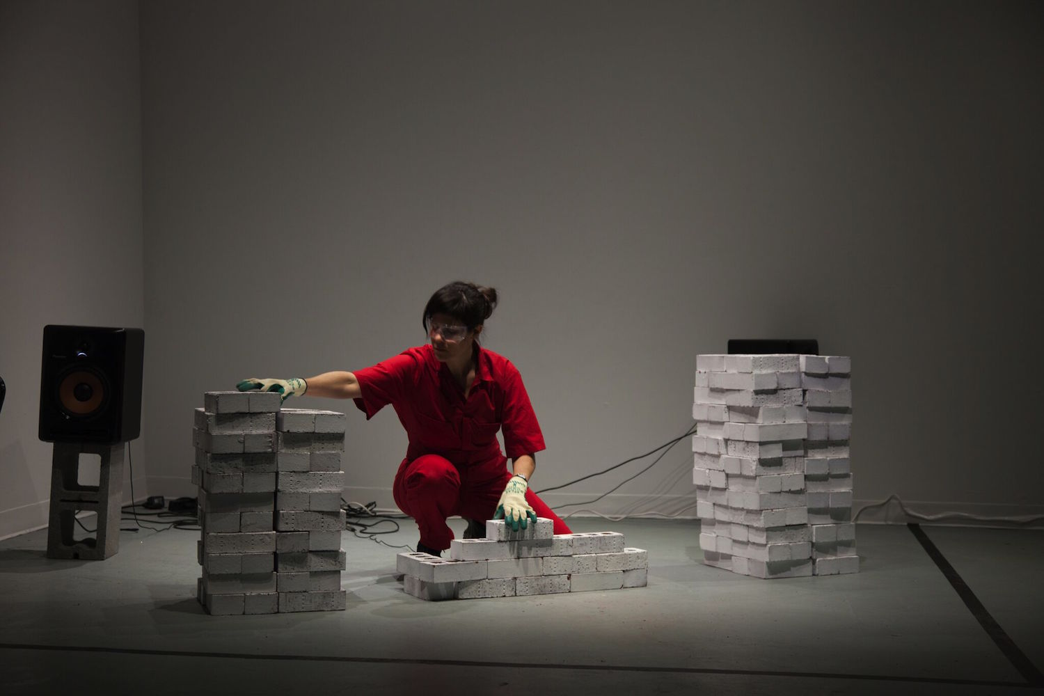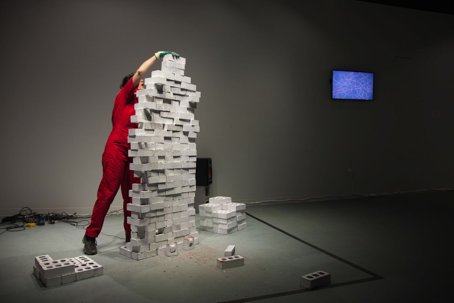 In “Occupational Enterprises,” Carrie Fucile used her body and the route act of constructing and deconstructing brick formations to critique cultural production and labor force within art museums and galleries. Her sixty-minute performance was a meditative and laborious expose; Fucile had to pause to catch her breath or wipe sweat from her brow as she arranged white bricks into unstable constructions and then mindlessly destroyed them. The audible process of the performance, the stacking and collapse of bricks, was transmitted by small microphones and broadcast back into the gallery as a cacophonous reverberating soundscape intermittently distorted by the artists manipulation of a series of effects pedals. The droning sounds coupled with Fucile’s monotonous movements was both hypnotizing and robotic.
