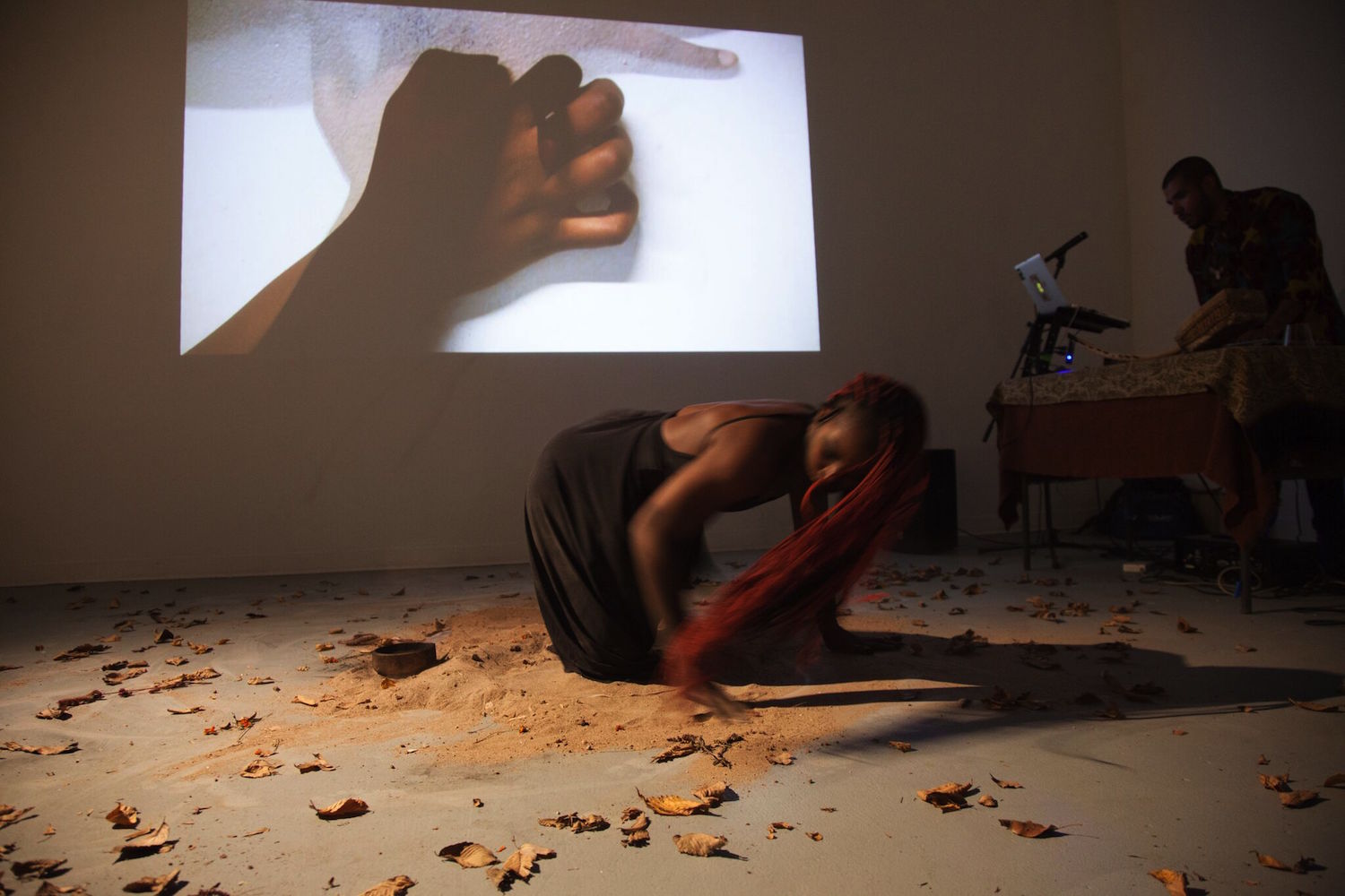A mound of sand and dead leaves establish the stage. A small bowl filled with black charcoal powder sat on top of the sand mound. Reeves’ soft, playful movements quickly shifted to erratic, distressed chopping motions, when the black substance in the jar that she rubbed onto her skin could not easily be removed. Her brown was stained charcoal black. The performance triggers long histories of Black women’s struggles to embrace and revere black aesthetics. “To create freedom where it was not given, to find freedom where it was lost, to manifest freedom where it was forgotten are all questions that “Eroica” invites the viewer to reflect upon,” Benitez and Reeves noted.