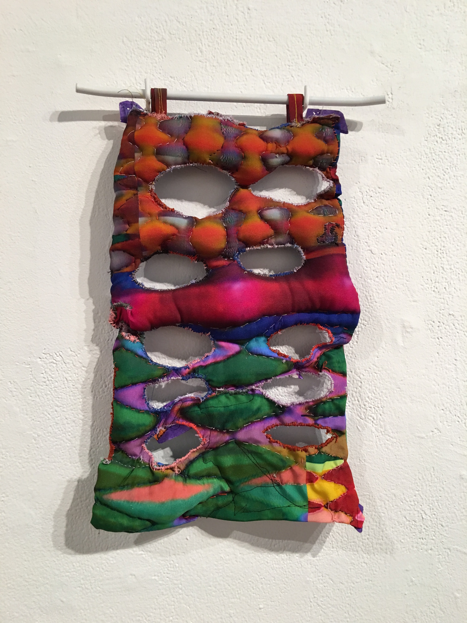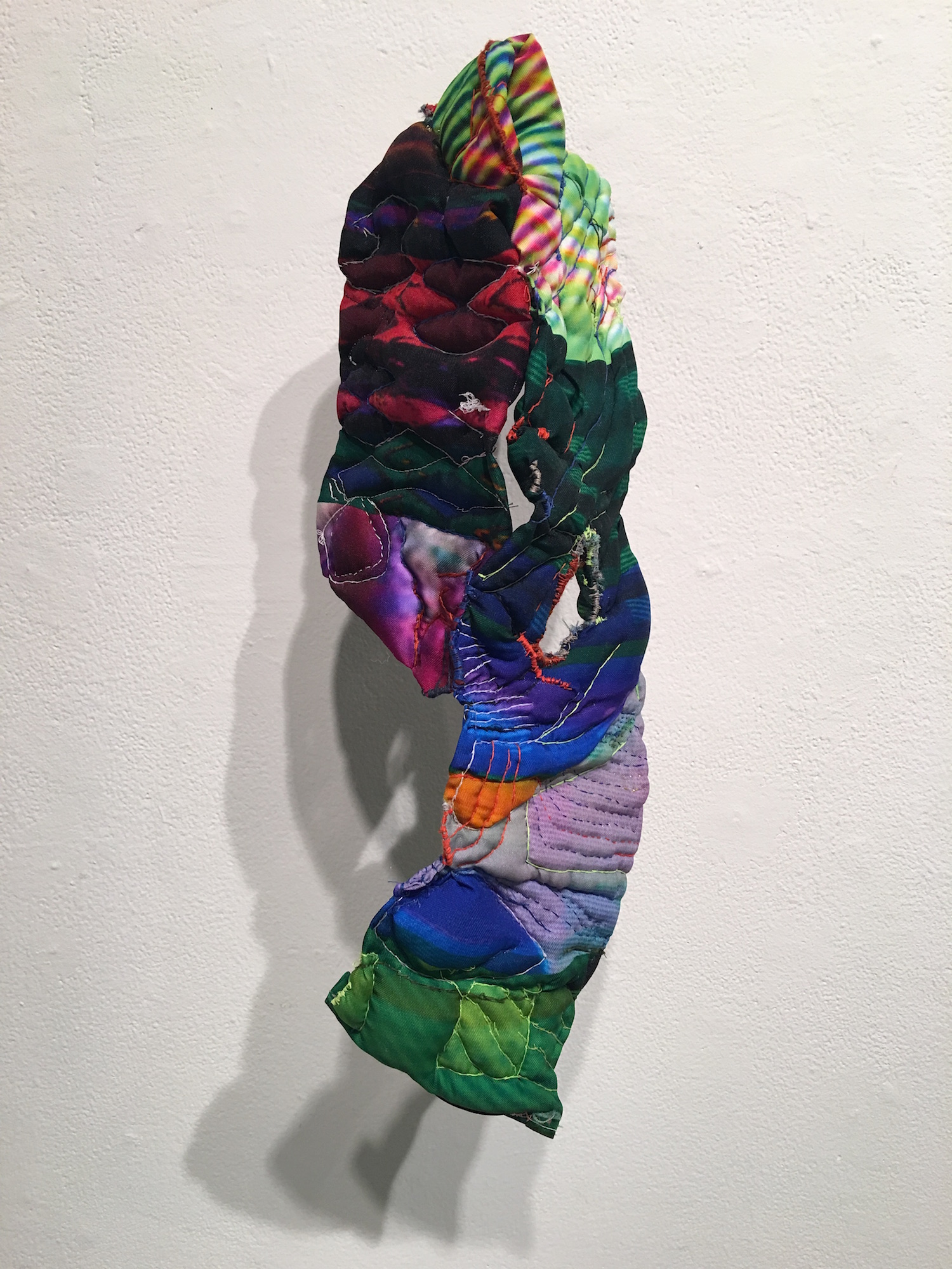 Like Boram, April Camlin is a visual artist and musician whose drum work with the band Wume impacts the rhythmic pattern of her geometric weavings. Her textural patterns, especially in Man In The Mirror connect to the exhibit’s repeated allusion to time and the way that even the most conventional norms can rapidly become obsolete and give way to new trends.