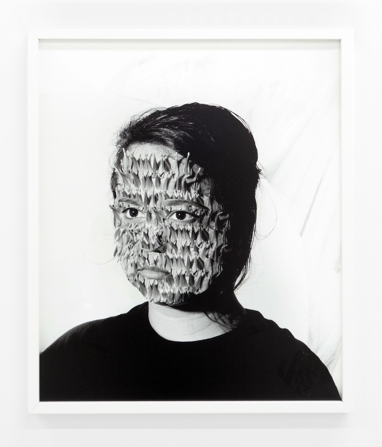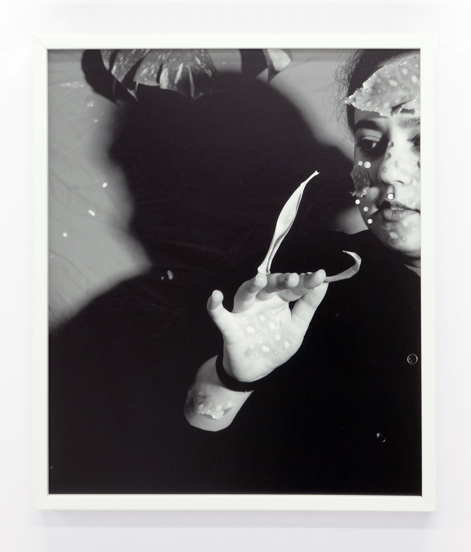 Azar’s black-and-white self-portraits limn the overarching theme of staid motion, freezing the artist in moments of varied confluence between flora and the understood human form. It is unclear in which direction one overtakes the other—much like a transitional still from the holographic covers of the 1990s science-fantasy series Animorphs. Alternatively, Azar portrays glimmers of a future in which the boundaries between nature and the body have increasingly withered away. In their place, the artist accentuates the modes of care and emotional resolve that materialize in times of vulnerable uncertainty.
