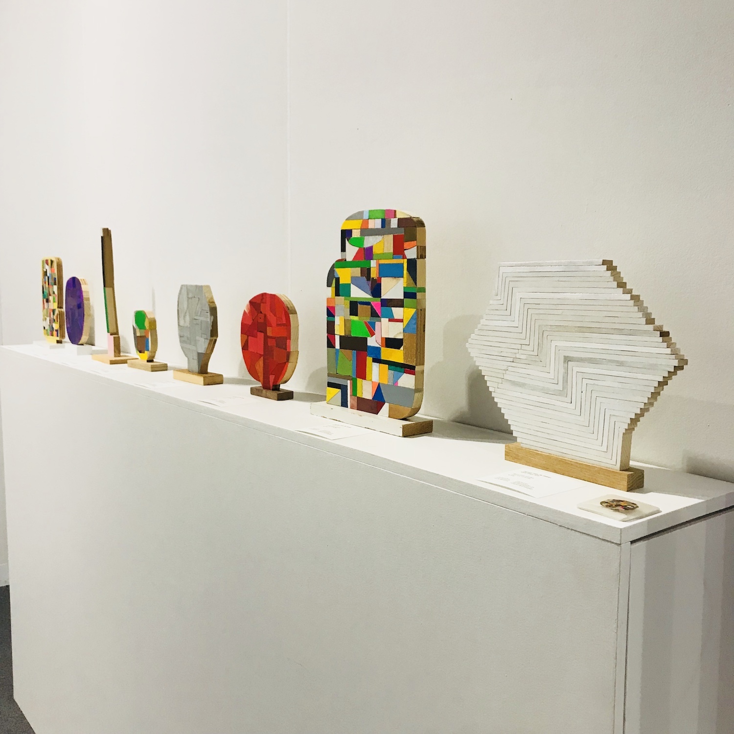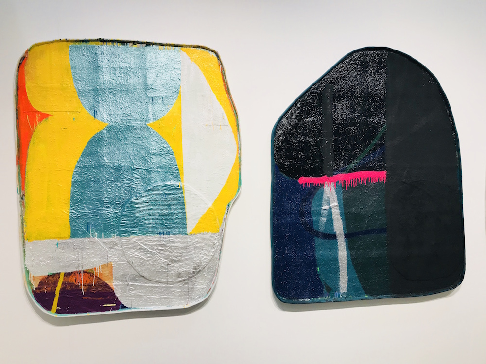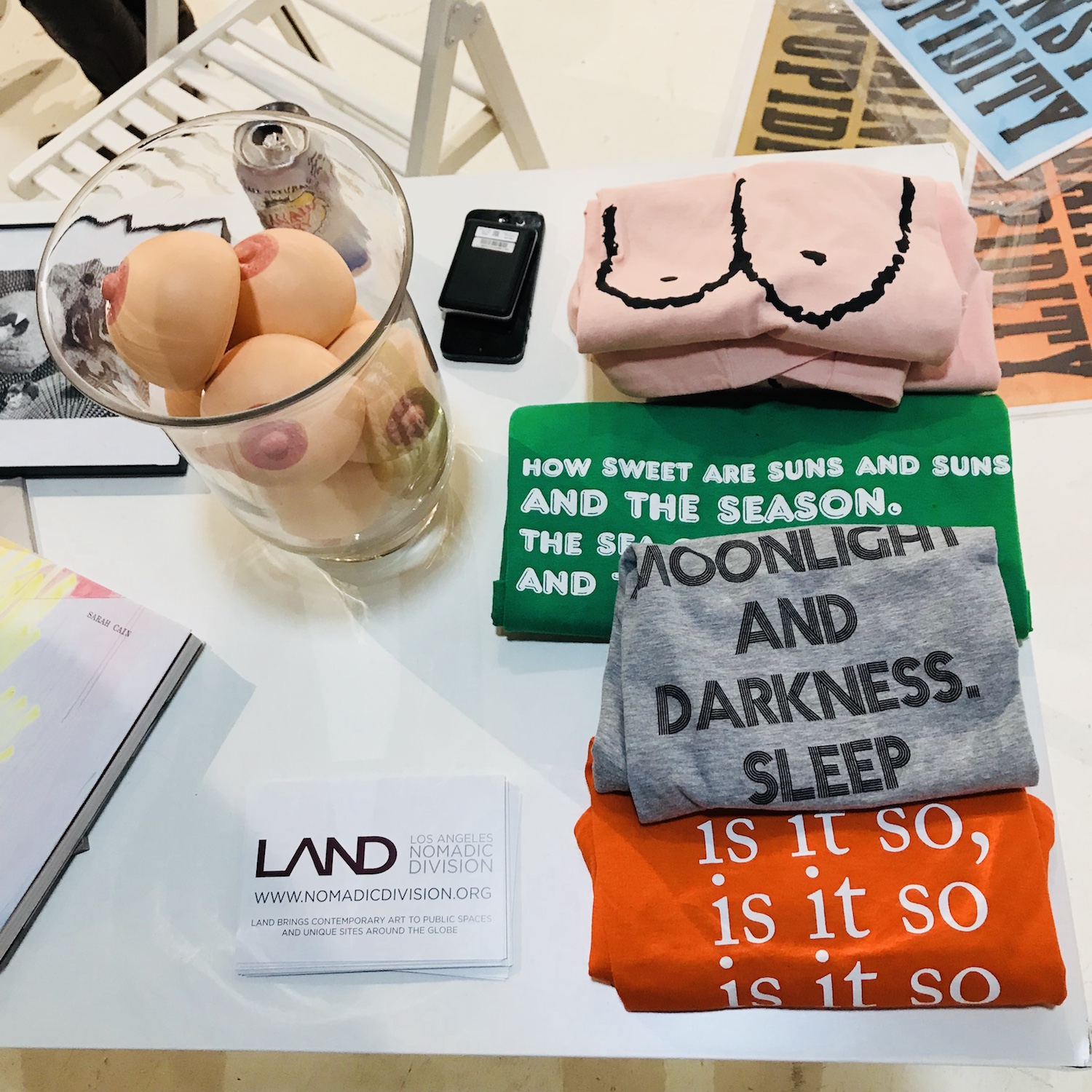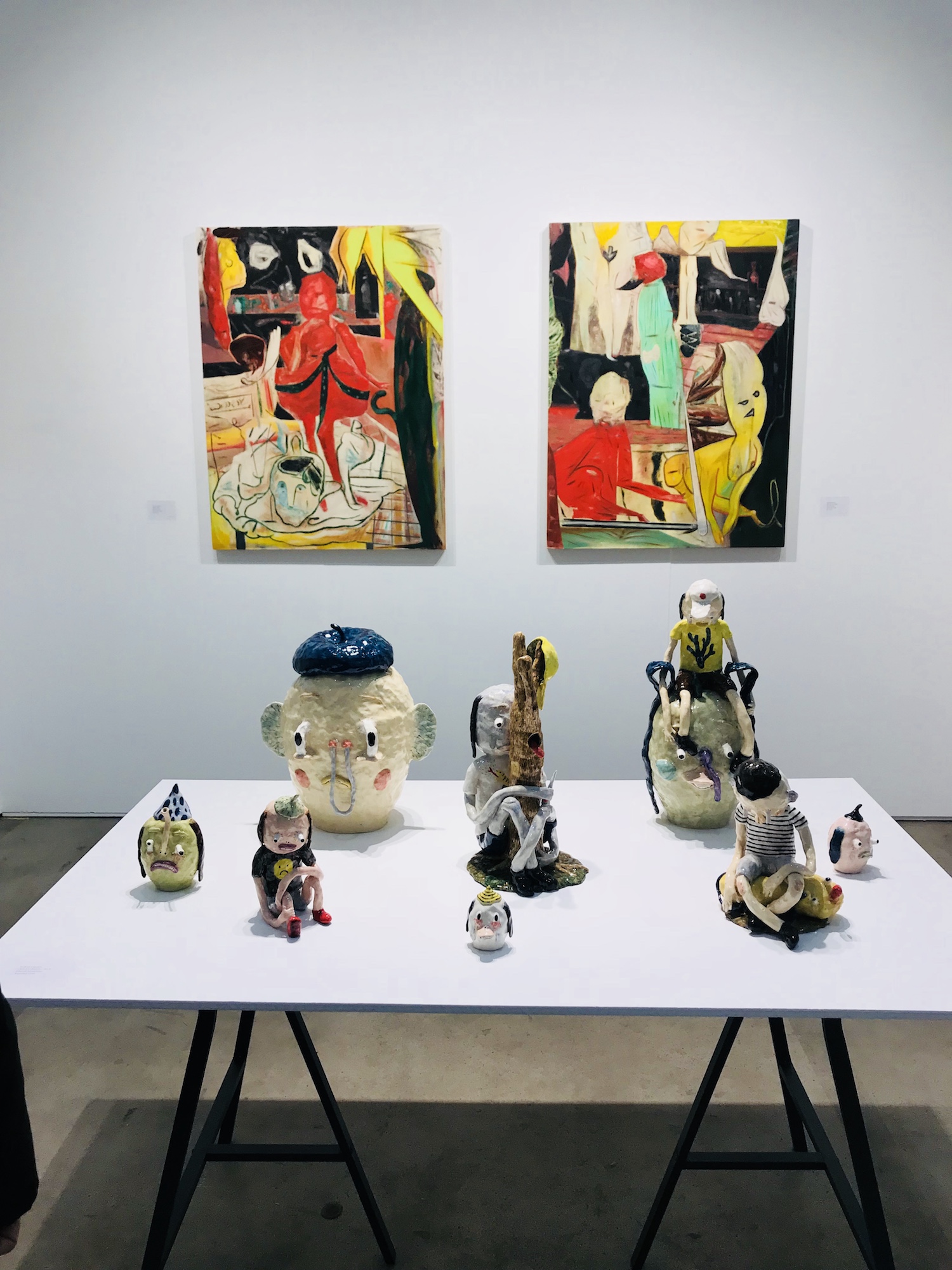 At NADA this year there were lots of garishly colored shaped paintings (think joyful, not tacky). There was a great variety of ceramics, ironic found objects, prints, and works on paper. There were zines, books, T-shirts, totes, and a giant 3 Channel video with 10 gorgeous pieces on a loop. Located upstairs in a darkened area, the videos were cinematic and colorful, sensuous and bold, with benches so that viewers could sit and be immersed. In addition gallery booths, NADA hosts mini-booths for non-profit art spaces and organizations, which adds diversity and an egalitarian feel.