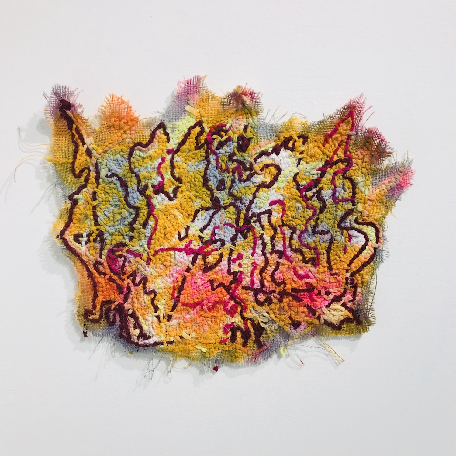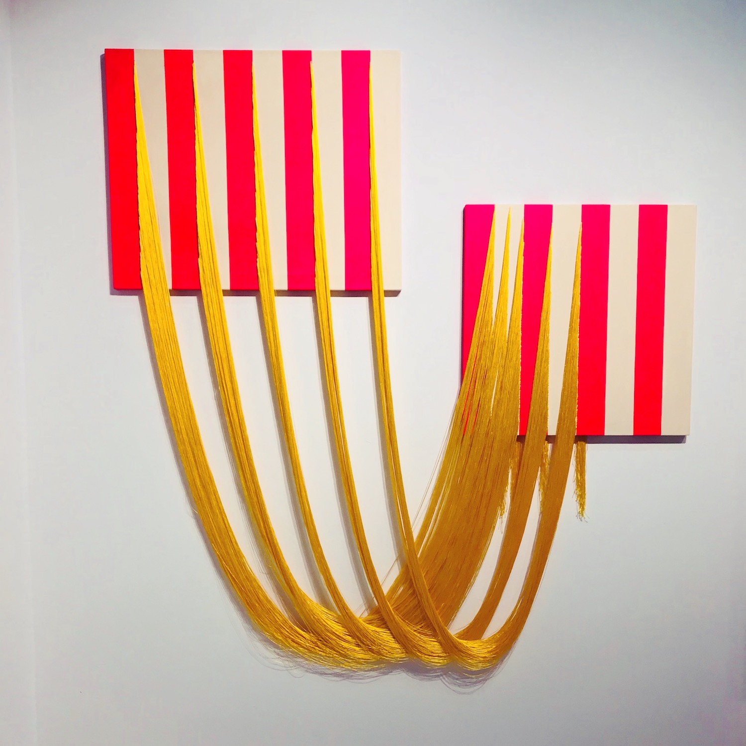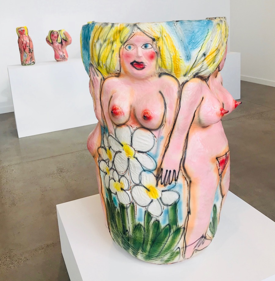 At NADA this year there were lots of garishly colored shaped paintings (think joyful, not tacky). There was a great variety of ceramics, ironic found objects, prints, and works on paper. There were zines, books, T-shirts, totes, and a giant 3 Channel video with 10 gorgeous pieces on a loop. Located upstairs in a darkened area, the videos were cinematic and colorful, sensuous and bold, with benches so that viewers could sit and be immersed. In addition gallery booths, NADA hosts mini-booths for non-profit art spaces and organizations, which adds diversity and an egalitarian feel.
