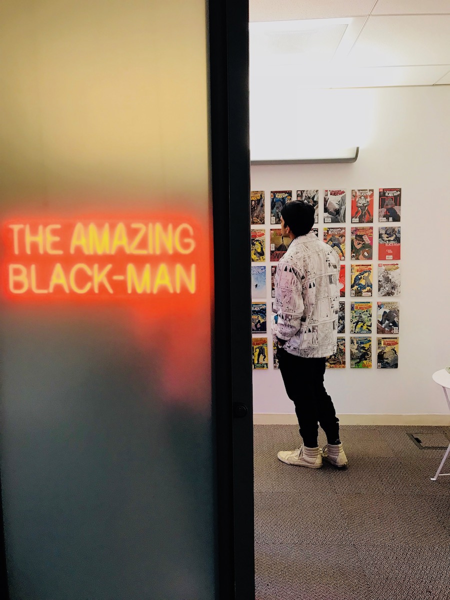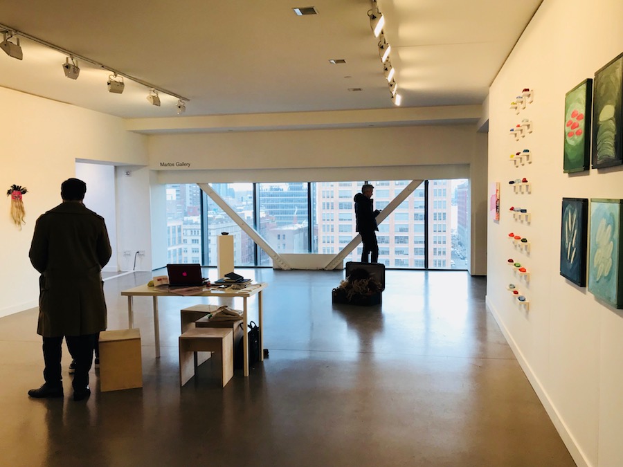 SPRING/BREAK has been hosted in a variety of temporary locations including St. Patrick’s Old School, and then the former James A. Farley Post Office. This is the seventh year for the fair, and the second year the fair has been at 4 Time Square Plaza in former Conde Naste offices, a warren of interlocking spaces with stunning views around the edges and cramped cubicles in the center. It was great fun to see institutional-looking cubbies, bookshelves, and office furniture repurposed for art, and a range of curatorial projects where some spaces were completely transformed and others bare and minimal.