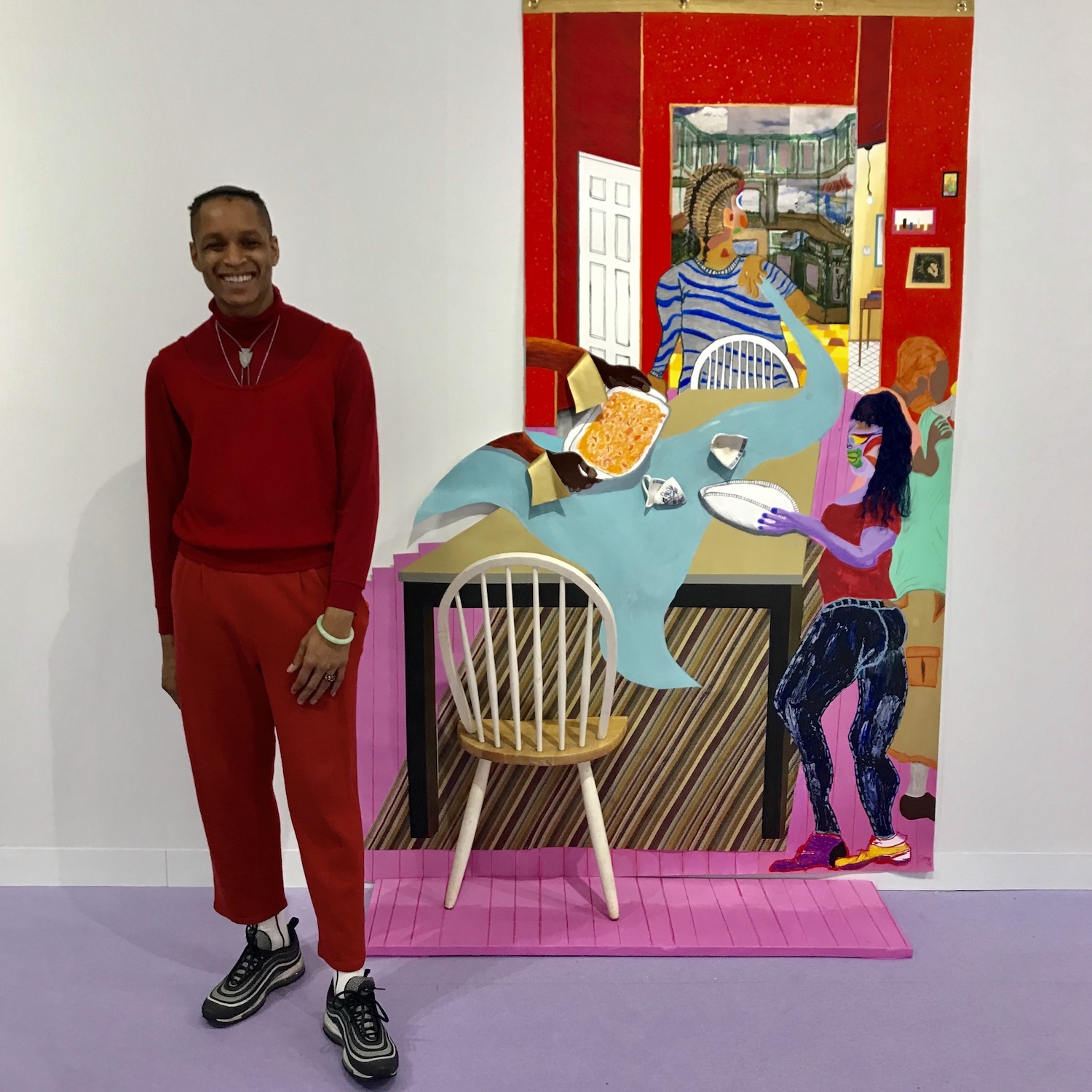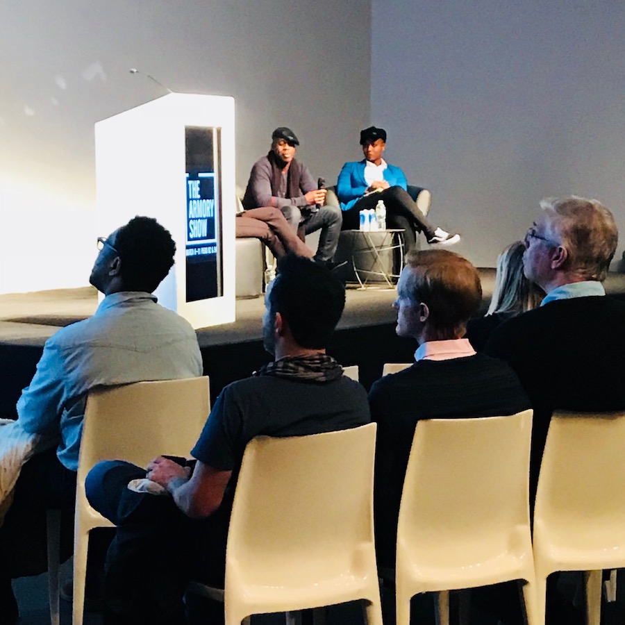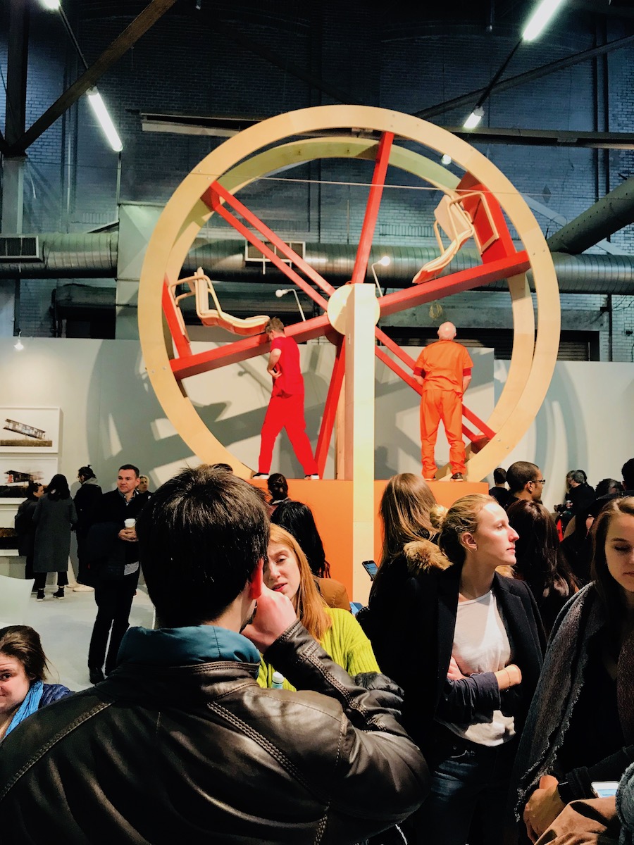 Lines. Lines. OMG Lines. I saw Ja’Tovia Gary being escorted into the fair for a lecture with Leonardo Drew and I thought, YES. This is the place to be. So many crowds. Big gallery names. Multiple VIP lounges. Two men sitting inside a giant hamster wheel with Ikea chairs. Champagne. Familiar Faces. Lots of jostling to see the art and, on the whole, the mood was friendly and upbeat.