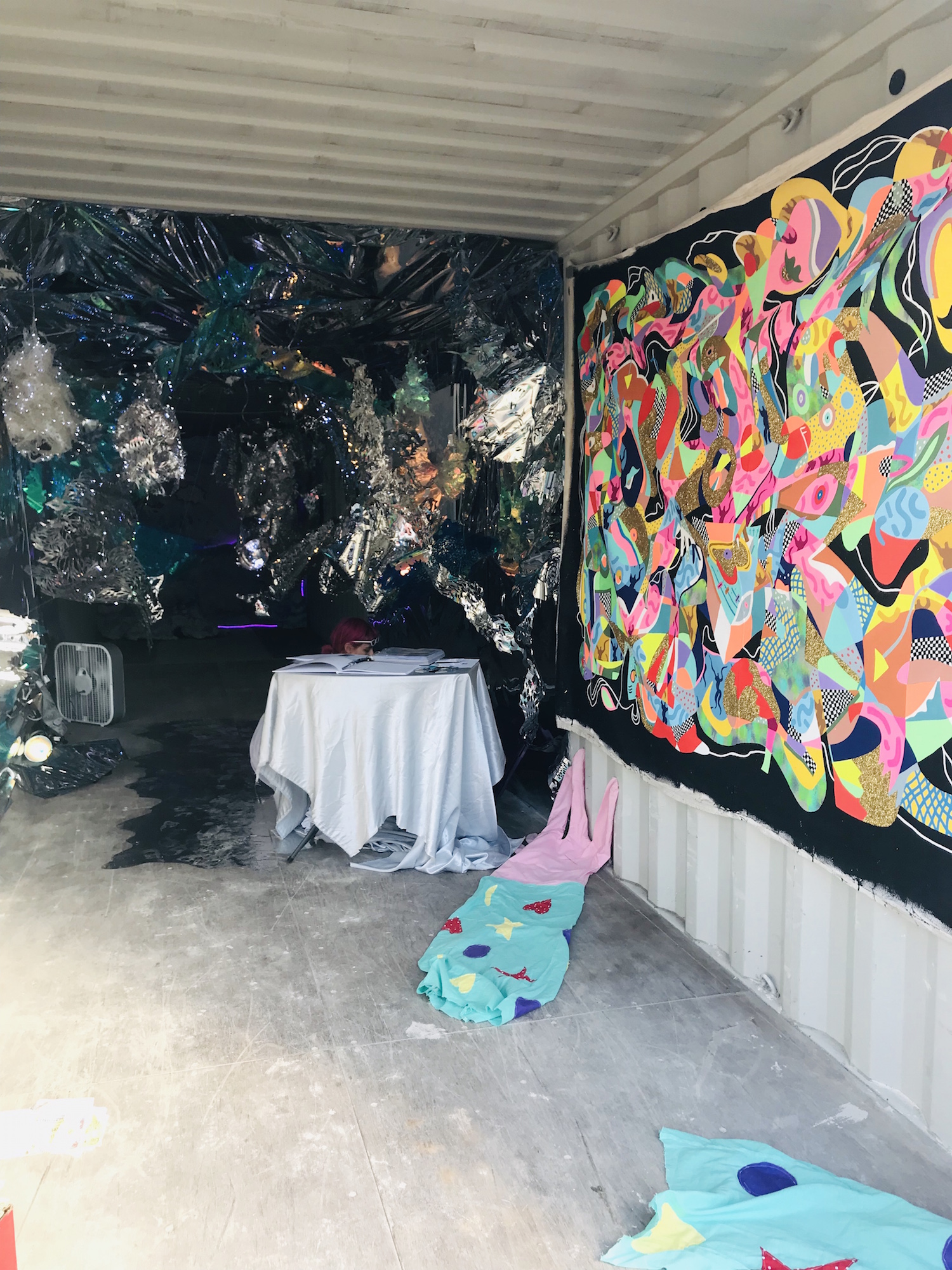 Housed in a fenced parking lot next to NADA at the Ice Palace Recording Studios in Wynwood,  this year’s iteration was different because each curated project was realized inside a shipping container. Some of the spaces felt a little undernourished, but, for the most part, each was delightfully unique and personable. Some functioned like mini-movie houses, others like a lounge; some felt like you were inside a trailer while others functioned like a bar. This year, Satellite offered a carnival-like atmosphere with giant inflatable sculptures, bubble machines, and the smell of french fries wafting from a poutine food truck, which enhanced a sense of adventure and made the gravelly parking lot seem exotic.