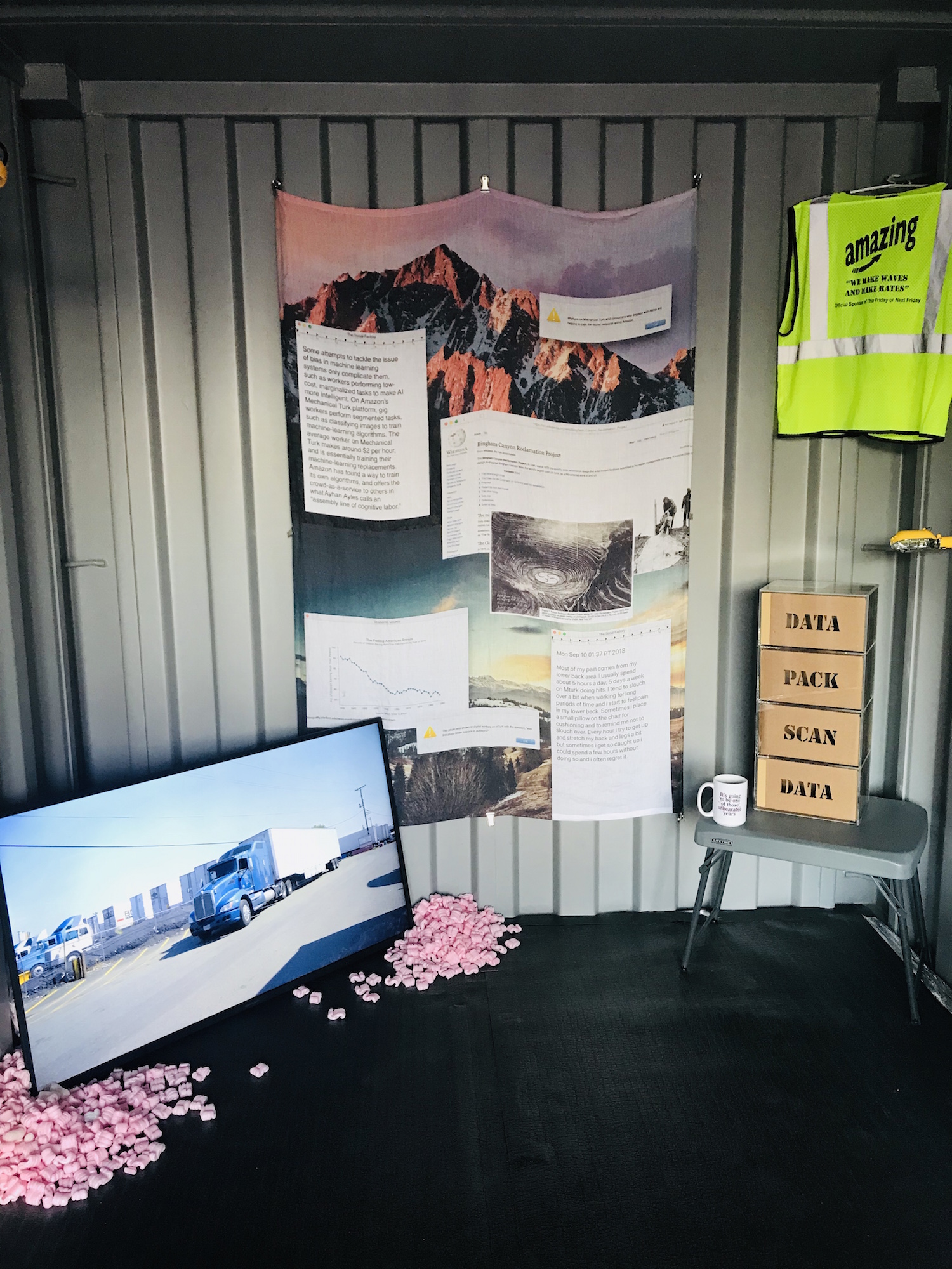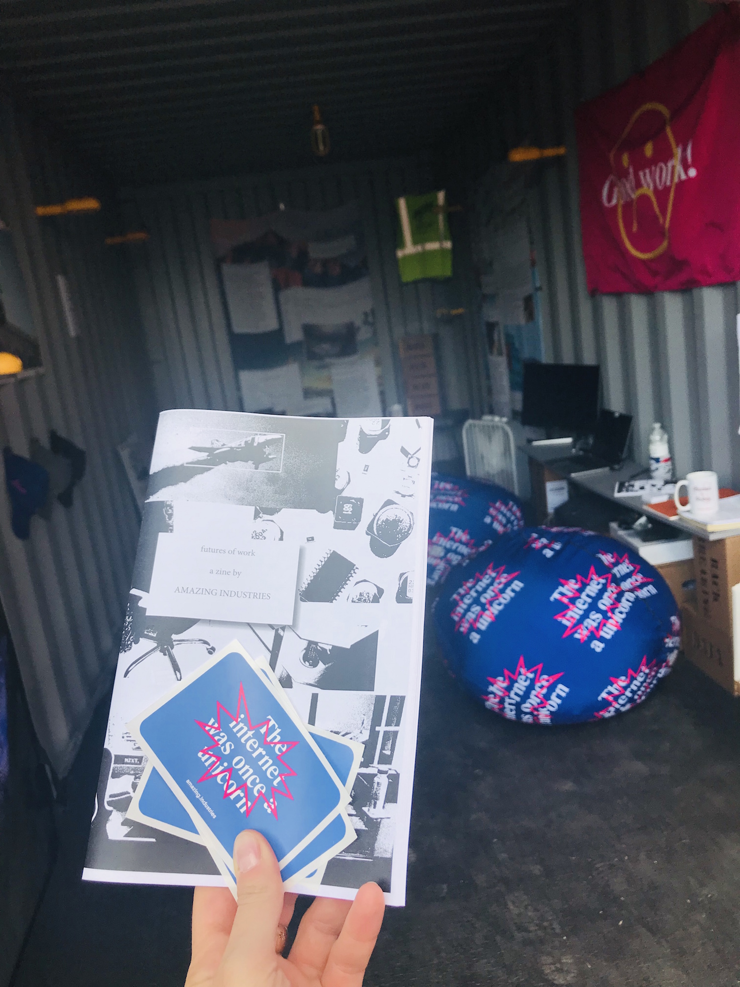 Bret Wallace’s Amazing Industries space was amazing to me, in that it offered a perfect replica of the generic but well-designed swag that all types of industries use to promote, yet it also completely acknowledged its own presence in a shipping container. There was no attempt to disguise or transform the trailer into something different, yet the beanbag chairs, squishy stress balls, flags, printed tapestries, stickers, periodicals, and even beer were consistently earnest, yet tongue-in-cheek, because the attention to detail and a certain techy work aesthetic were so completely realized.