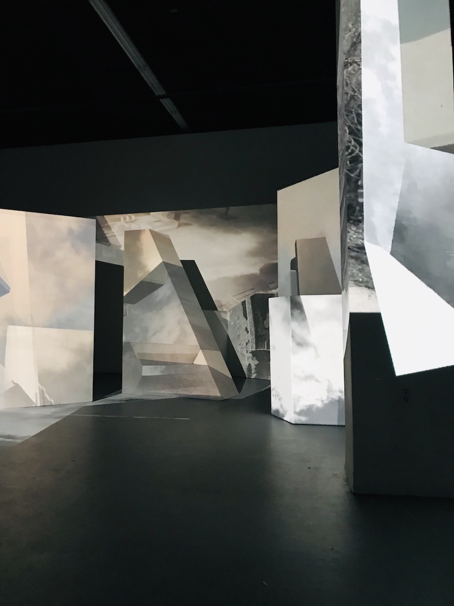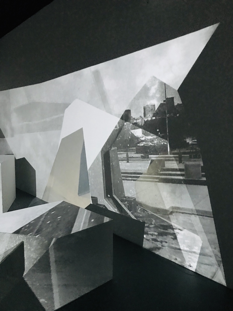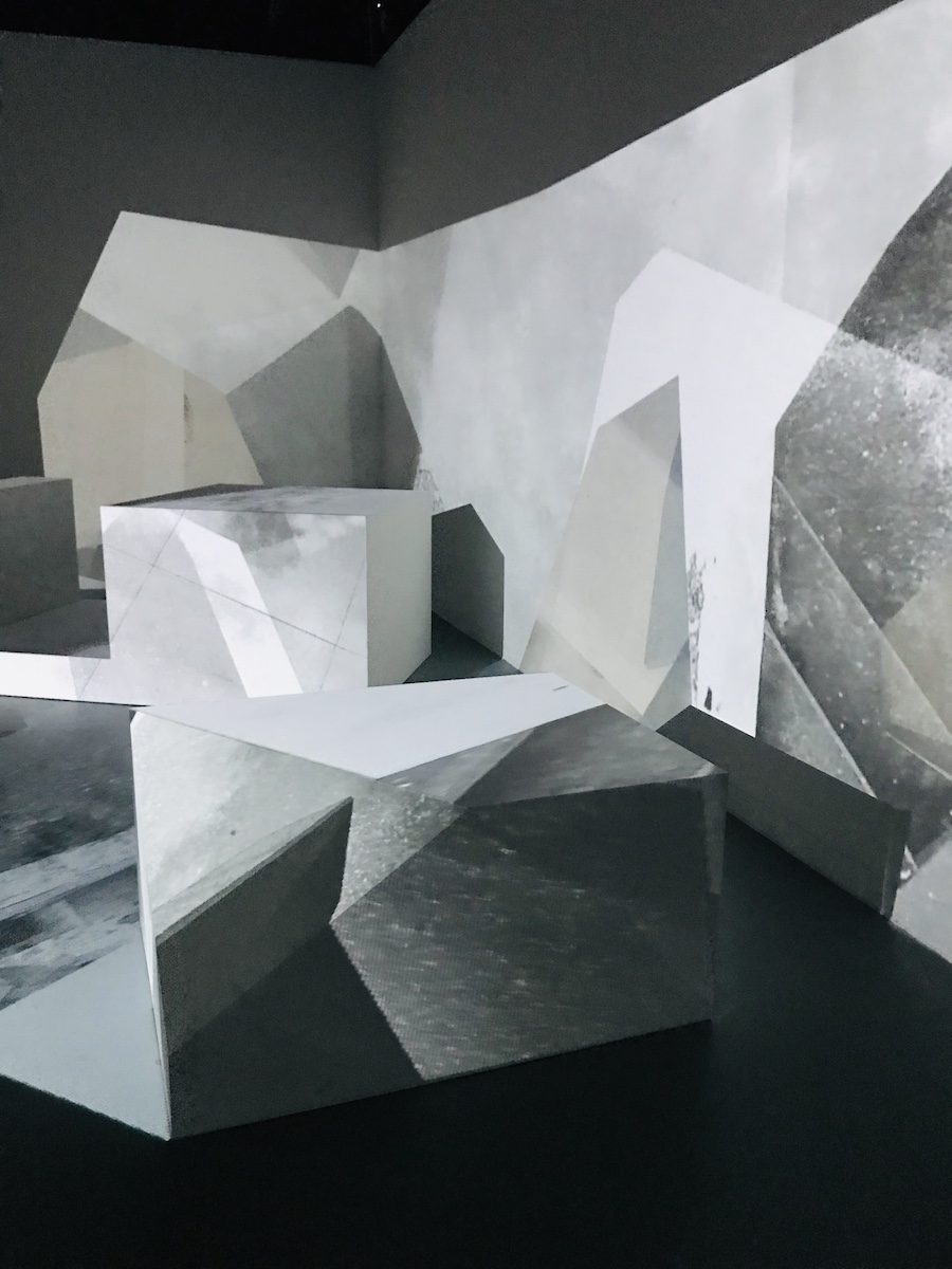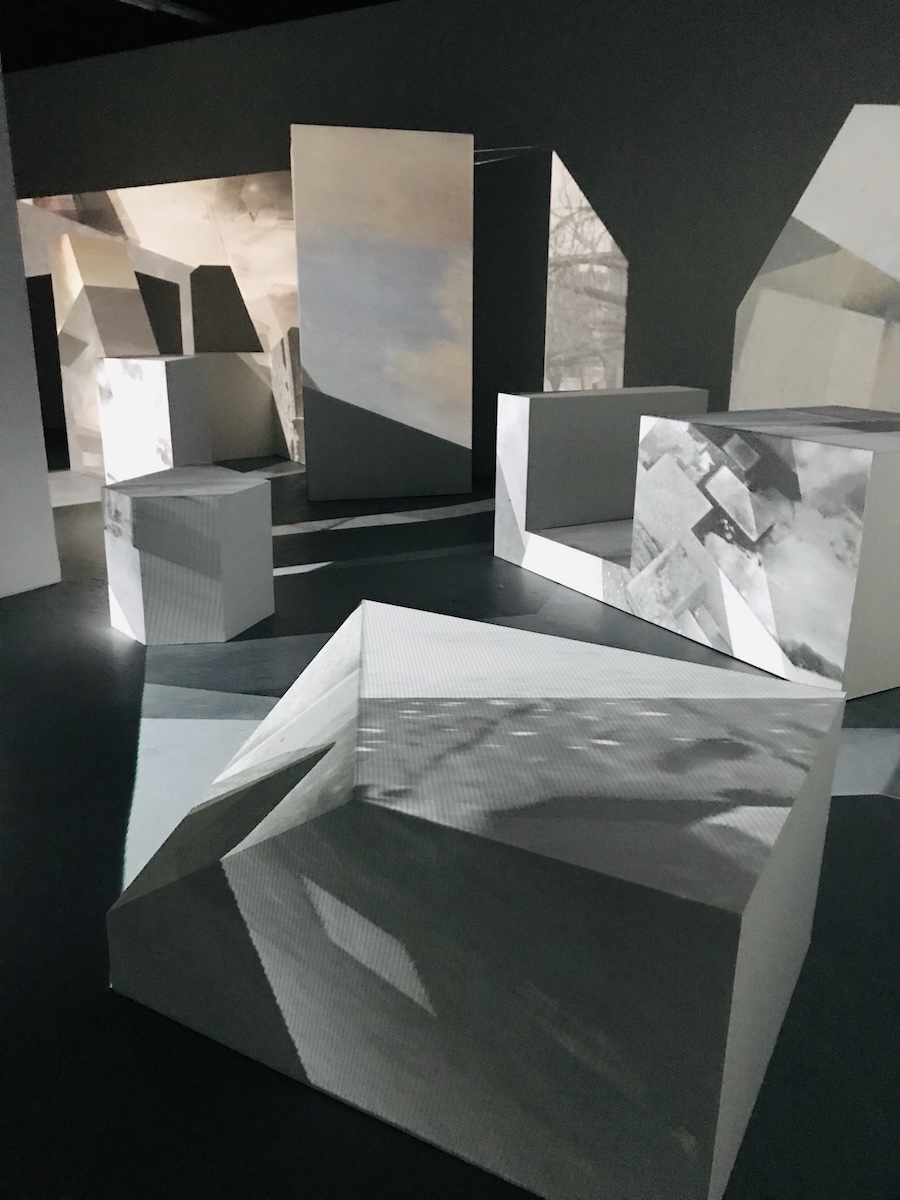 This installation combines many different elements, but not too many, and segues from monochromatic into subtle coloration at the back of the gallery. Images of the Brutalist structure, both abstracted and whole, blend with snippets of street scenes, the vague sound of traffic, and aerial views that refract over white geometric podiums of strange iceberg-like angles. It’s an Ingmar Bergman beach in abstraction. It’s white, gray, black, and tan, with buttery marble, gritty pavement, chilly sky, and squares and rectangles big enough to sit on. It’s a field of warm geometry. It’s an ecstatic religious experience, multi-sensory but not sensory overload.