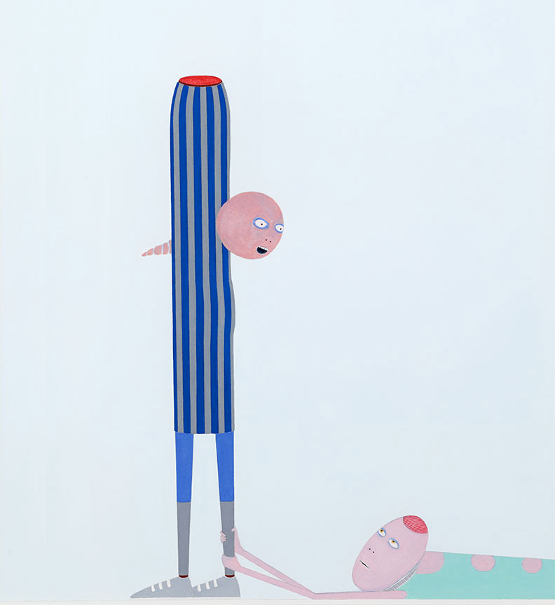 In one of Ali’s paintings, a pink-skinned figure wearing a peculiar green leotard lays on the ground in supplication, grasping at the ankles of a semi-headless figure wearing a blue-and-gray-striped garment and gray sneakers. Instead of having a head atop their neck and shoulders, the standing figure’s head is attached to a cone-shaped neck emerging from the abdomen. (The cone is also vaguely genital; other figures have curlicue pigtail-like appendages or concealed button-like mounds.) The head, round and bald with purple-lined eyes, shouts down in what seems like fury toward the beggar.