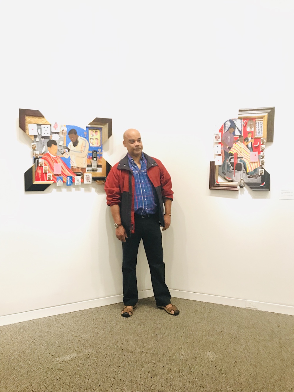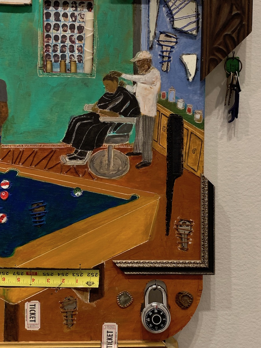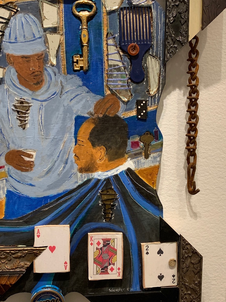 Mixed media is being widely spotlighted in long term museum solo shows with notable artists like Mickalene Thomas (commissioned to take over the BMA’s East Lobby this fall) and Mark Bradford (whose work “Pickett’s Charge” is up on an entire floor of Hirshhorn in Washington, DC through 2021) combining elements of adornment and traditional fine art media to challenge our preconceived notions of race, class, and gender. Cherry is doing a little of that himself by using physical signifiers of Black culture and trade such as dominos, shells, beads, playing cards, cut-up frames, and locks with keys, as well as focusing a series of works on a traditionally Black space of community and commerce: the barber shop. By using the tangible materials of these spaces and combining them with the traditional fine art media of painting, Cherry gives his audience a tactile element that roots the work in reality.