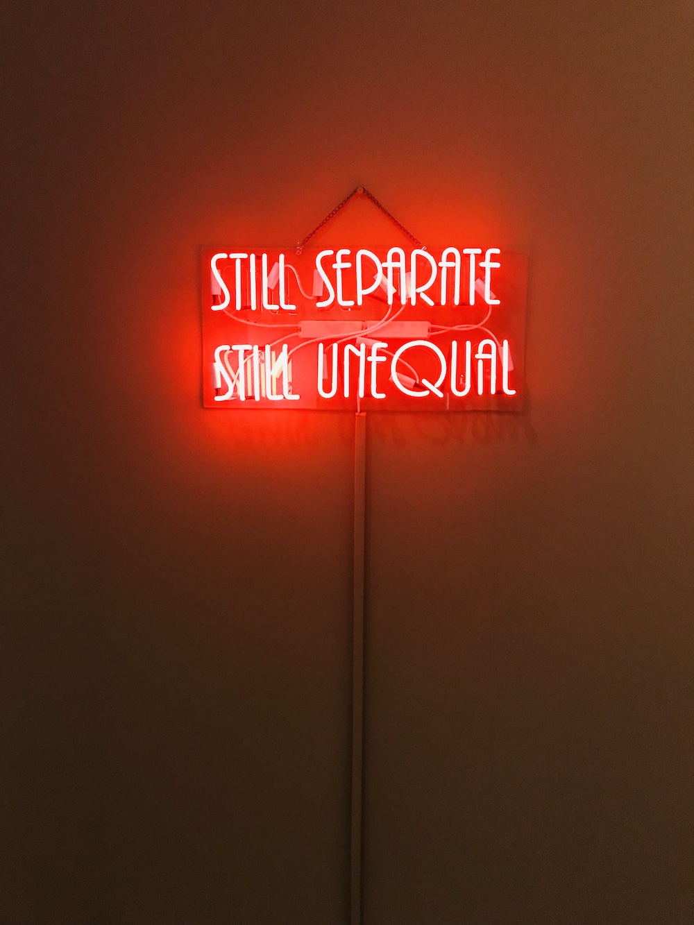 A few very sweet images beam among the heavy analysis and may propel viewers toward more urgent engagement, like the photograph of three young children crowding against a window, looking outside. Reflected on the window glass are power lines and buildings surrounding their home, and if you catch this photo at just the right angle, Brown’s red neon spelling out “STILL SEPARATE STILL UNEQUAL” reflects off of the kids’ bodies, too. (RK)