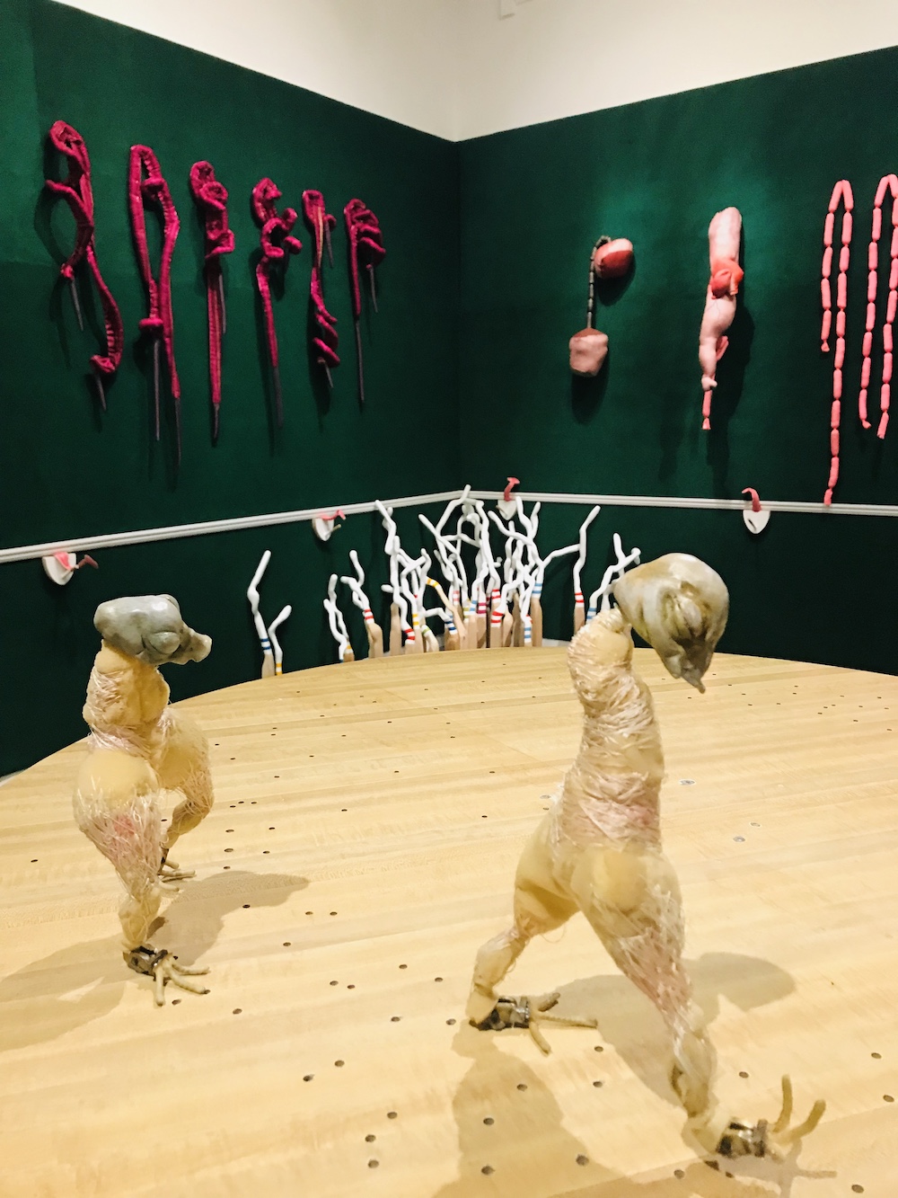 Other corporeal associations abound in Williams’s work, on a small video screen displaying her beautiful stop-motion animation, where balut (a fertilized fermented duck embryo, boiled and eaten from the shell, traditionally as Filipino street food) engages with stereotypical food from marginalized communities like Aunt Jemima syrup and Uncle Ben’s Rice. Using food as a metaphor, all of Williams’ work reflects the artist’s heritage and family history, contrasting American history learned in school with the stories passed down from family members. Regardless of medium, Williams offers macabre and humorous observations about human bodies, meat, food, and the way the names we assign to all aspects of our lives build contrasting hierarchies of taste. At the Walters, Williams offers a Muppets-meet-Manson aesthetic that reminds us that we are all made of flesh, blood, and sinew, just like the animals some of us choose to eat and that we have choices in the way that we engage with the complexity of history, identity, and bodies.