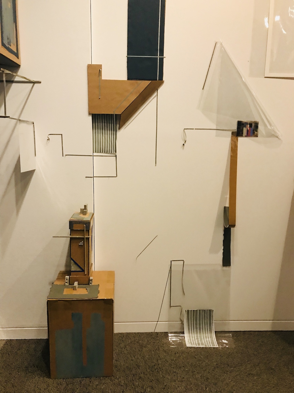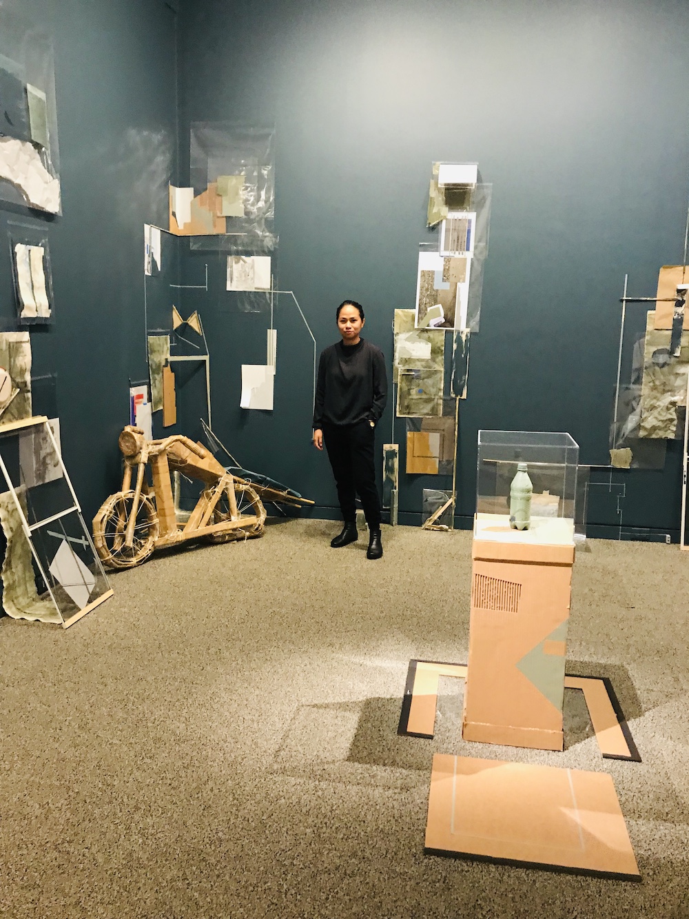 A single plastic bottle filled with gooey gray paint sits at the center of “Banal,” 2019, an installation of cardboard, nails, house paint, concrete, wood, tape, and plastic. Its placement at the center of the gallery under a glass vitrine further highlights its absurd power. Rendered as an art object, you notice its clean design, its approachability, the comfort it offers, and simultaneously its potential for destructive power, filling our oceans and landfills with tiny, toxic plastic bits that last thousands of years.