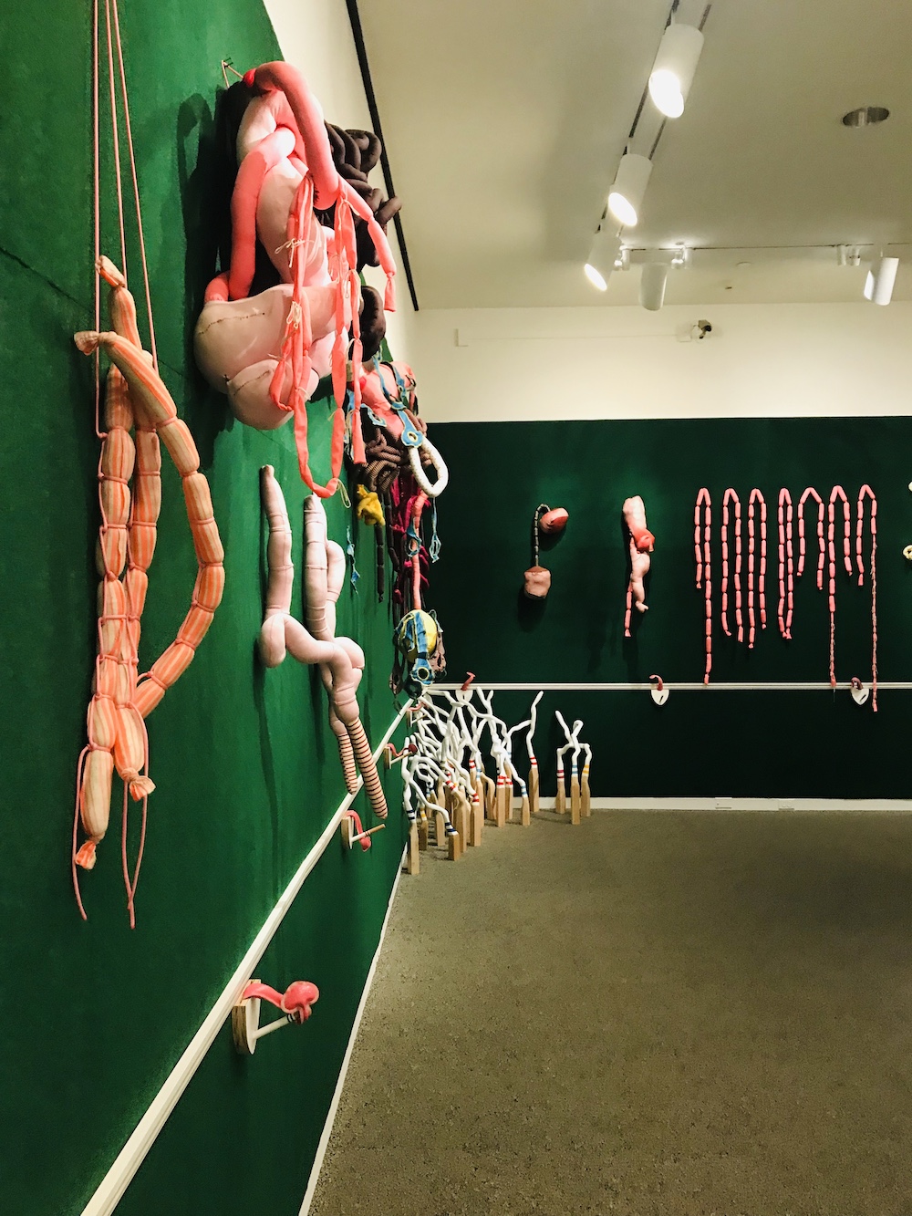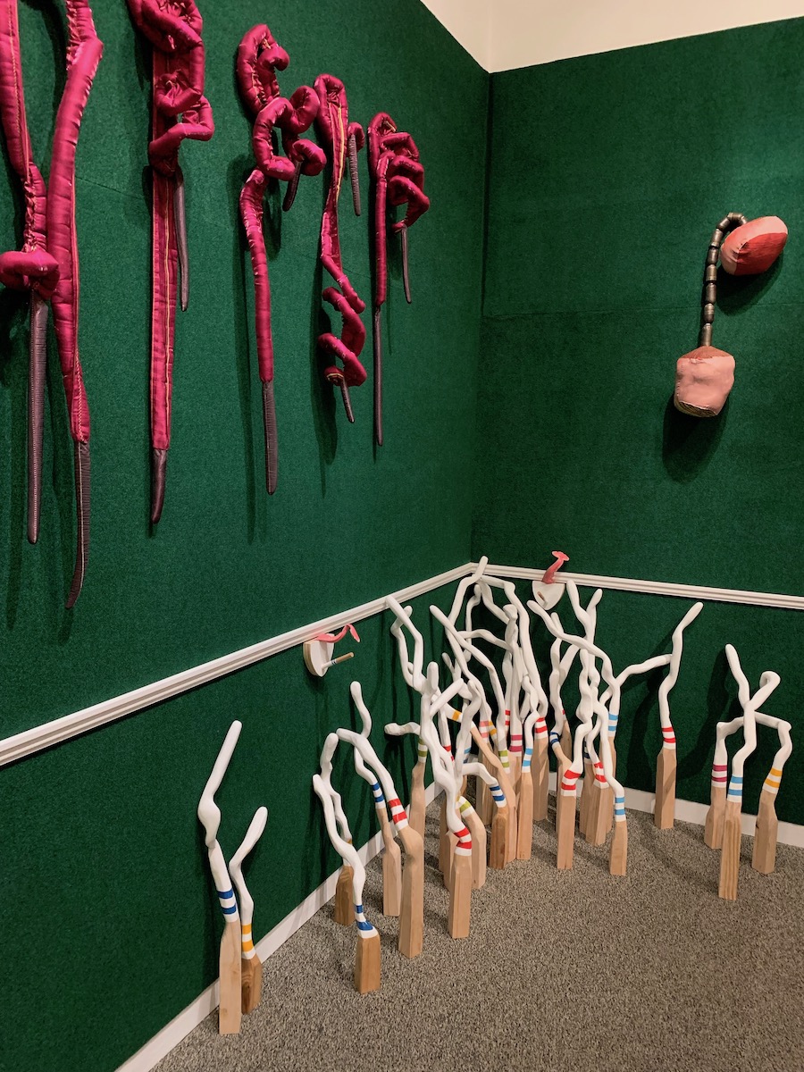 Ropes of sanguine pink sausages cascade down a fuzzy green Astroturf wall in the final Sondheim finalist exhibition space. Stephanie Williams’s sculptures capture Americans’ fraught relationship with food, specifically with meat, eating, and their own bodies with larger implications upon the way Americans define themselves. In this installation, the sculptures hang fleshy paper chains, assorted reds and pinks contrast mightily with the green backdrop, and for me, they conjure up the fantasy of farm animals munching happily in green pastures before being slaughtered and ground up into sausage and larger questions about how larger narratives swallow up marginalized ones.