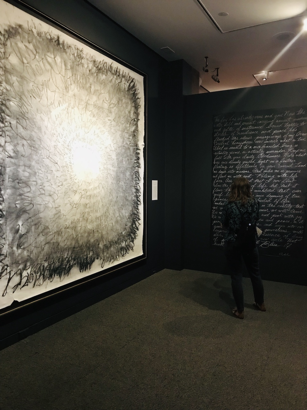 While essential to the maker as mantra and affirmation, the once legible written words of the work have been largely obliterated by the repetition of writing and rubbing, the end result looking like a close-cropped picture of a gray flower with a white center created by the author’s knees. According to the artist’s website, these shapes are meant to be spirals which for the artist and her grandfather, an important teacher and influence upon her work, are a symbol for expansion, transformation and evolution over the challenges of life.