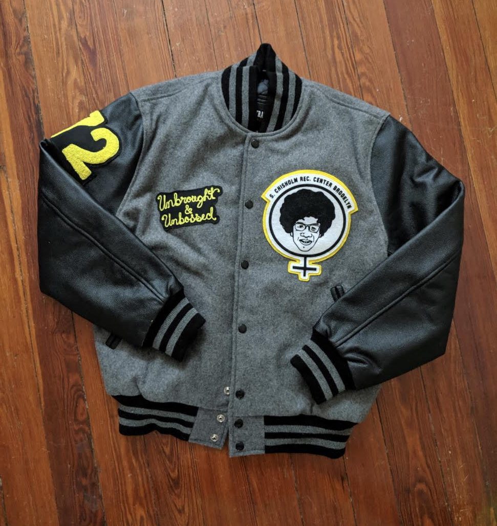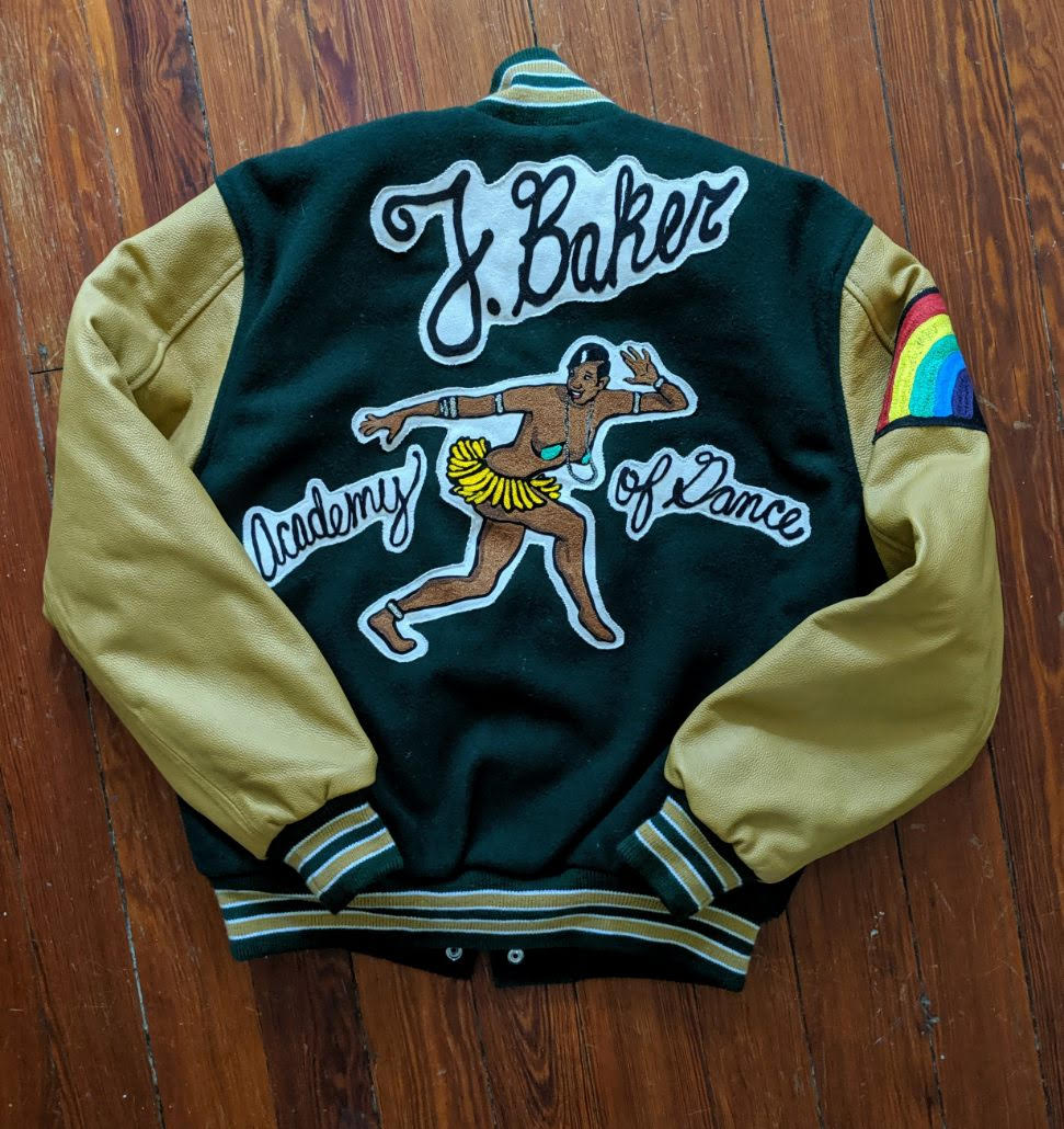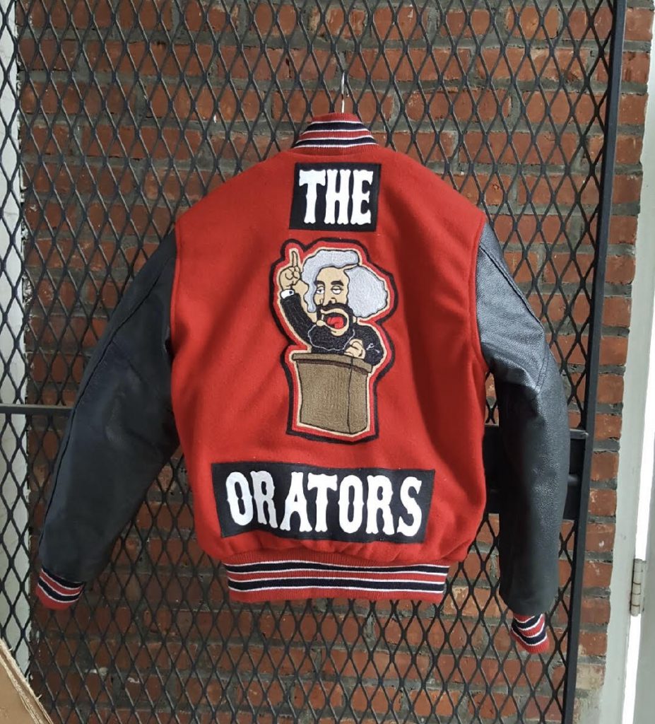 When I was asked to put together an exhibit at the Banneker-Douglass Museum, the executive director, Chanel Compton, came through and said, “Could you create a space that’s just like your home and just put it into the museum as an exhibit?” So I thought “Okay, that’s cool. But let me take it a step further. Let’s base it off of Douglass’s different places that he had in Maryland.” So I had three corners of the room, one was based on Douglass House, this place, one was based on his Washington, DC property, Cedar Hill, and another one was based on Twin Oaks, which is in Annapolis. When I was deciding what to put for this place, it was more brick and just a little edgier than the other properties so I decided to focus on art and custom fashion and asked Arvay, “Can you base it off of Frederick Douglass?” We did a Letterman jacket called “The Orators.”