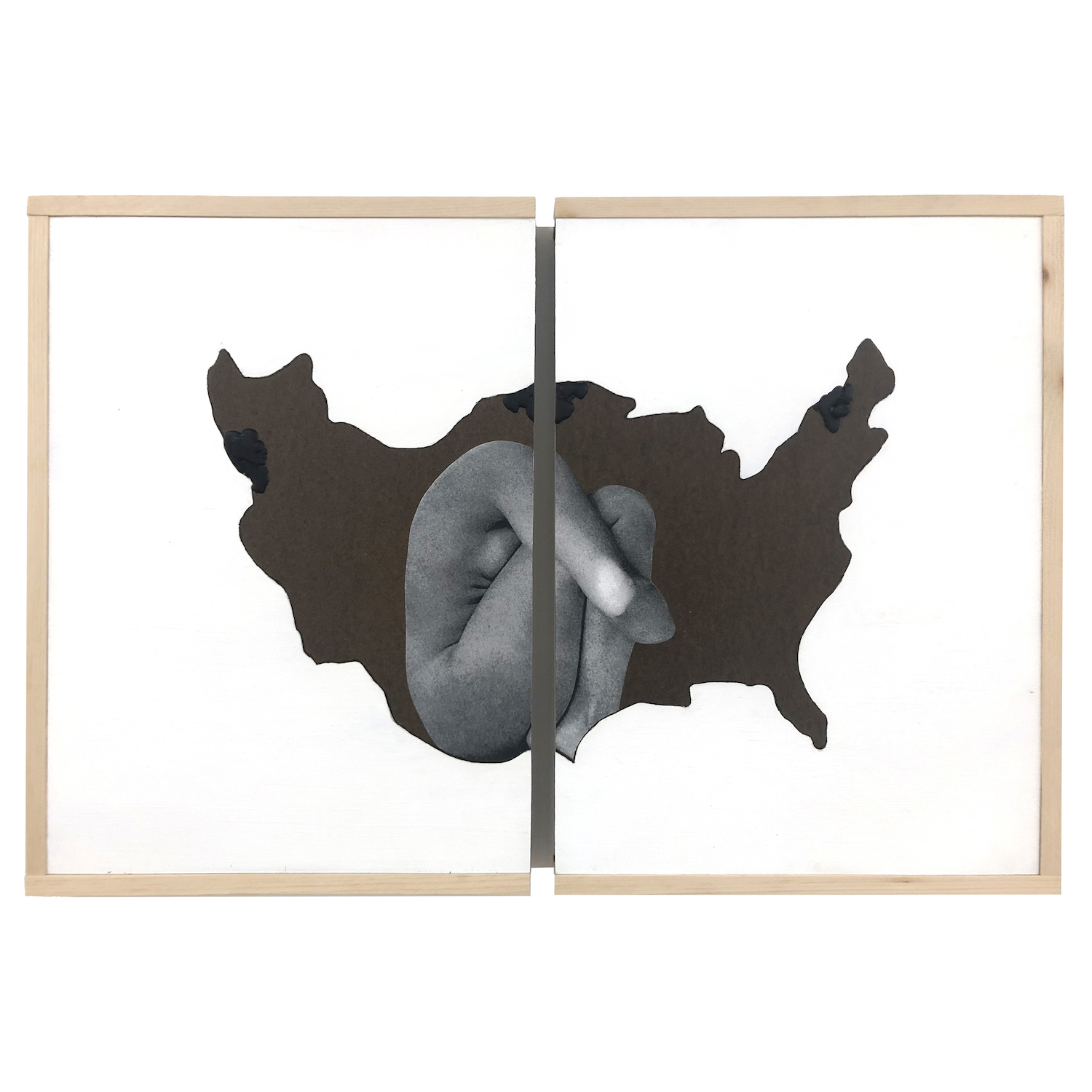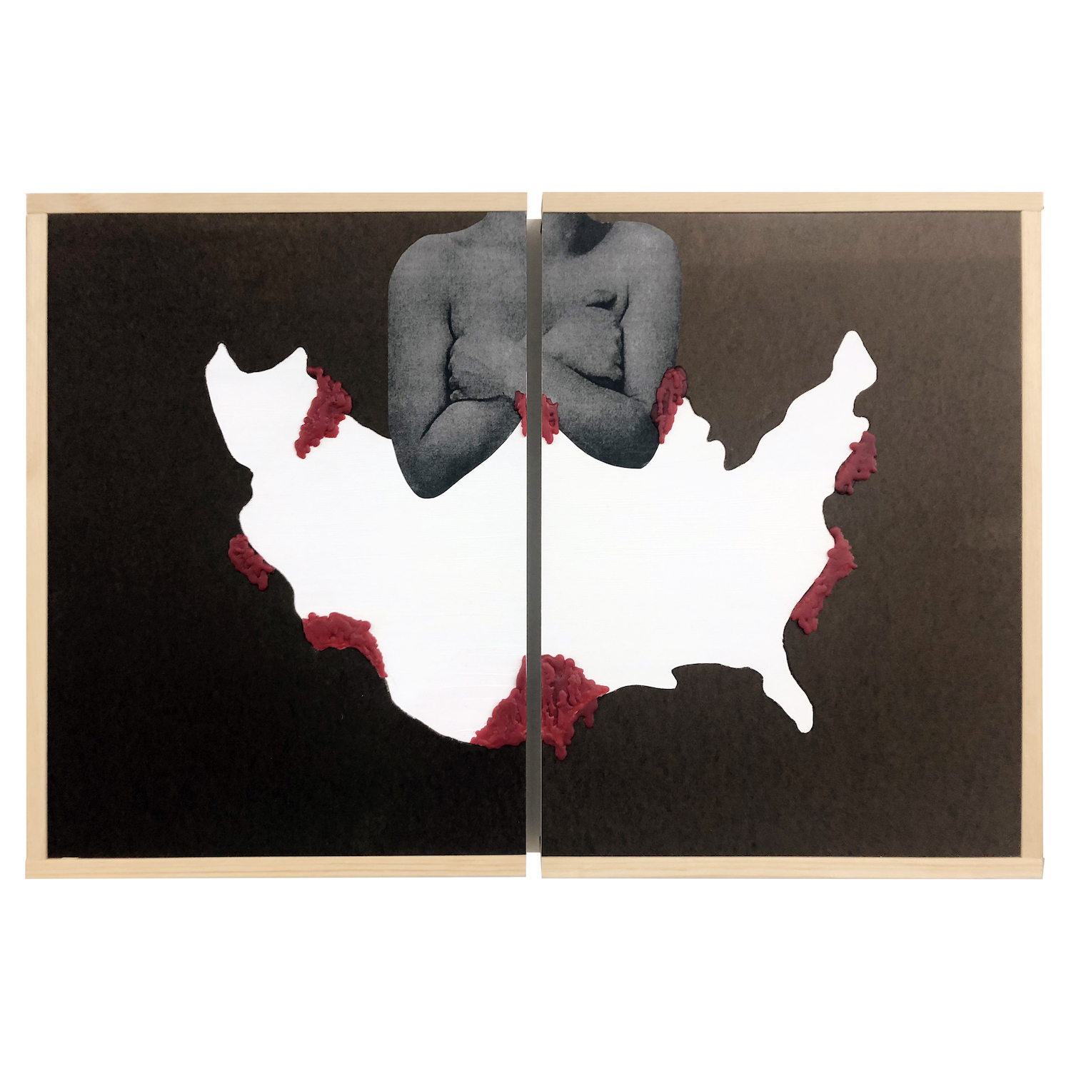 What do you think when you see someone wearing a hijab, or the shape of the continental US? Do you take the time to meet the person underneath, or question the US branding of “freedom and justice for all?” Iranian American artist Mojdeh Rezaeipour grapples directly with these questions in her work, and uses analog collage techniques to suggest that Western social mores for women’s bodies come from a similar origin of gender-based control as the stricter customs of her native country.