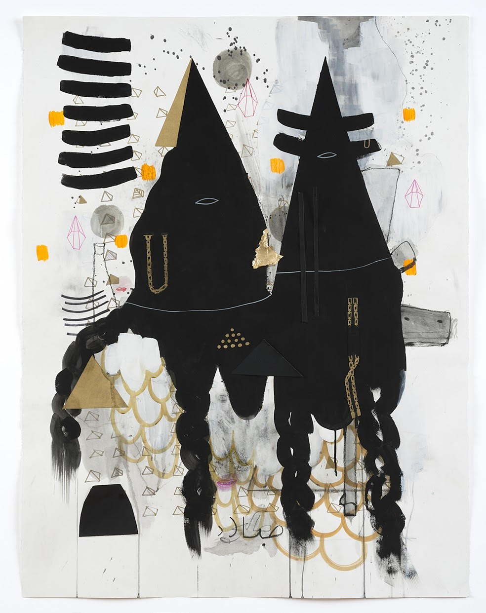 Milad, who is of Egyptian and Honduran heritage, threads Arabic and Spanish text into her frenzied compositions. In “Egyptian Lady” beneath a large gold chain (one of the artist’s recurring motifs): “Te da miedo que no necesito tu cultura.” In English, “You’re scared that I don’t need your culture.” By playing with the seemingly disparate elements that go into identity, Milad illuminates the agency we have over culture, how we create our own as individuals and as communities. Throughout Chaos, the repetition of culturally entrenched images reflects the patterns between categories that dissolve rather than enforce them—like the pyramids, which not only represent architectural feats of both ancient Egypt and Mesoamerica, but also appear on United States currency.