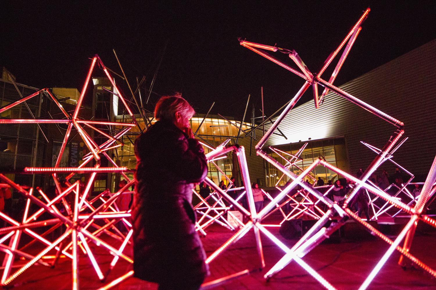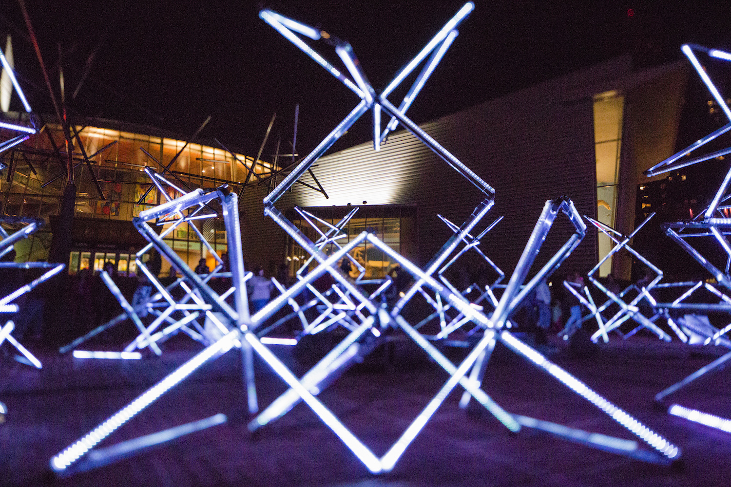Radiant Flux by Kevin Blackistone: Radiant Flux is an interactive sculpture consisting of over 100 independently moving triangular mirrors exploring the many facets of light through solar reflectance by day and moonbeams at night. By day, participants will have glints of sunlight cast upon them while having their mirrored image form and deconstruct itself in oscillating patterns. At night, the reflections will continue but will create a light display of colored shards moving with the participants and colored by the pulses of music