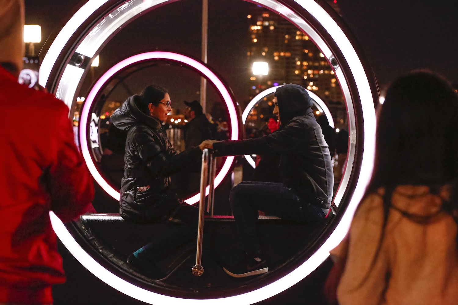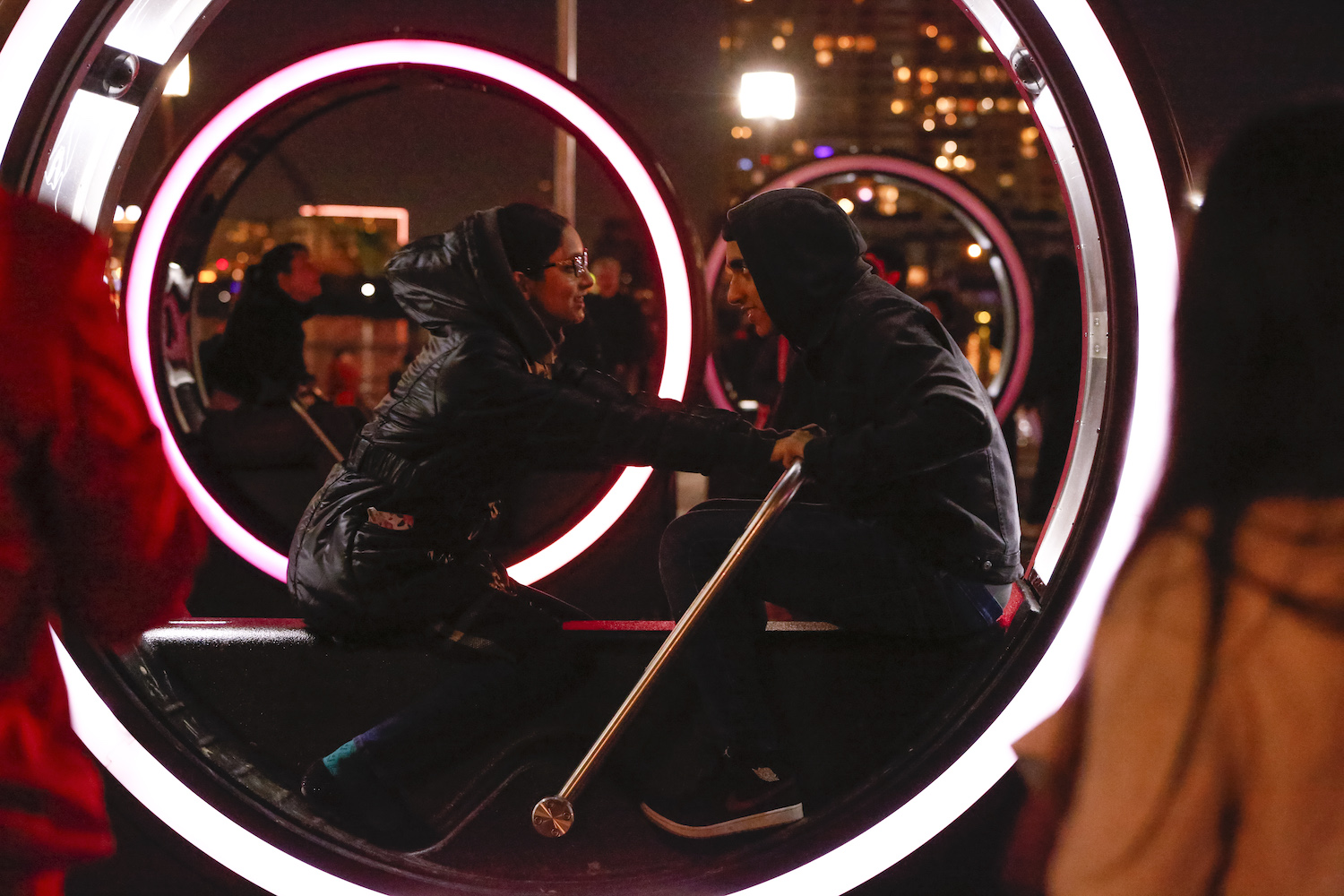 Loop by Ekumen and Jonathan Villeneuvue: The retro-futuristic machine Loop is a cross between a music box, a zoetrope and a railway handcar, that creates animated fairy-tales. Through the combined efforts of members of the public working the hand lever, the image cylinder lights up and creates the illusion of motion in the drawings. The black and white images, tinted through a strobe effect, recall the earliest movies. The speed at which the images fly by, the frequency at which the light flickers and the rhythm of the audio composition are directly related to the pace set by the participants, who can be of any age.