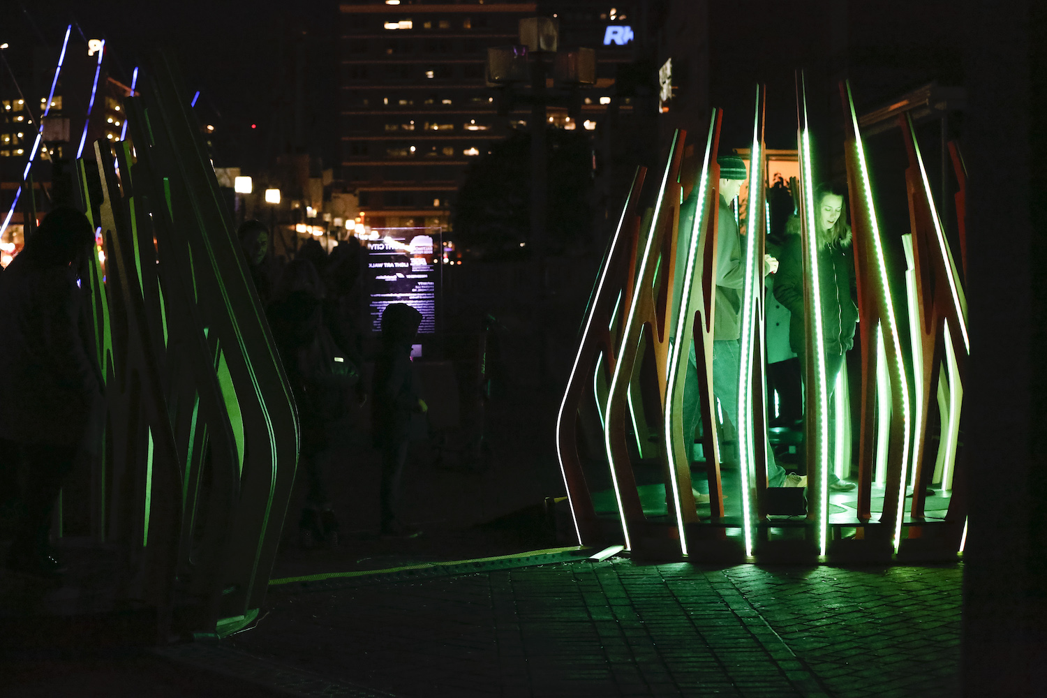 MAPP by AlexP: MAPP is an abbreviation of Mapping At Private Properties. It is a mobile point-and-shoot video projection mapping system. The installation consists of a video projector, a camera and a laptop running custom software developed by AlexP. Everything is mounted together on a pram. MAPP makes a scan of its surroundings using the camera and subsequently shows an abstract and moving video mapping. Visitors of Light City can “step into the light” and become part of the artwork. Once the scan of the visitors has been made, they walk out of the light and see themselves in the colorful projection. Don’t forget to bring your camera for your light-art-selfies!