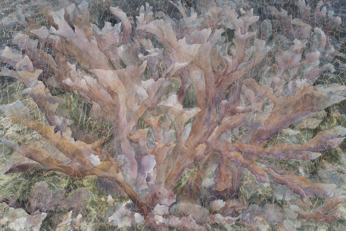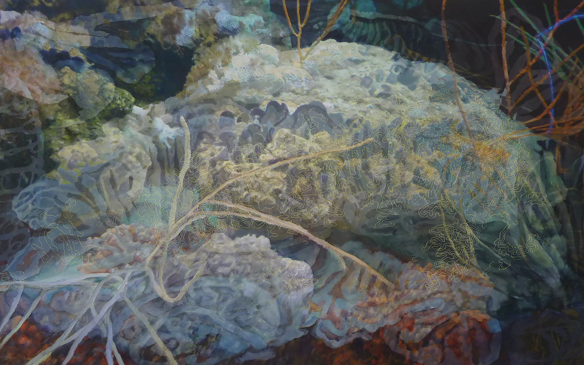 Christine Neill, “White Death,” 2019, and “Reef,” 2017, watercolor, archival pigment print on paper and framing Plexiglas, 34” x 47.75”