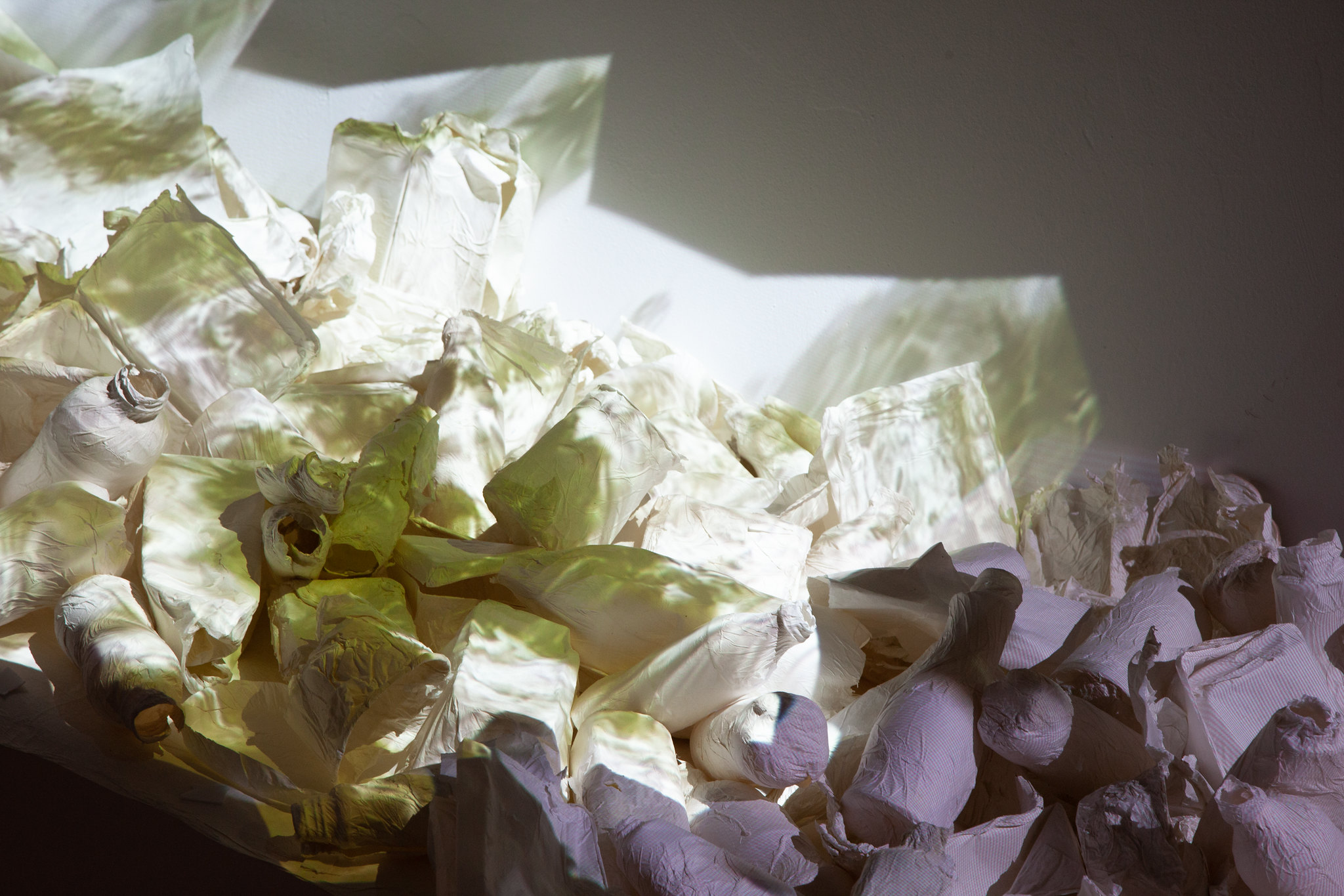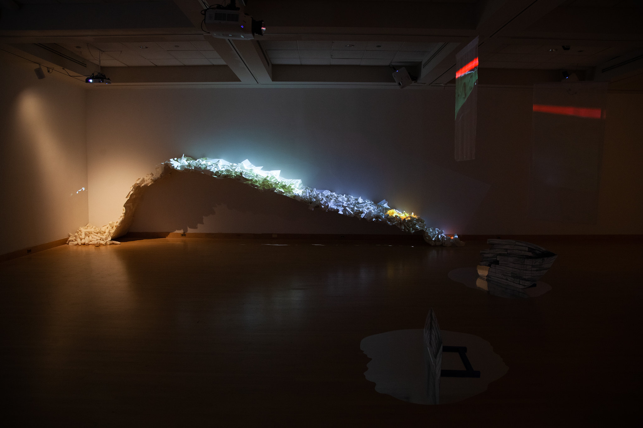 In “Drowning,” Schmidt reflects on her experiences in the Taipei Artist Village in Taiwan and the aggressive recycling tactics the small island embraces to combat the environmental damage from accumulating trash. Her river of recycled paper ghosts of plastic trash, and the shifting images of a fish pond projected across its surface, create a tangible anxiety, reminiscent of what Schmidt felt after returning to the US from Taiwan; although she found her experiences in Taipei heartening, she realized that the rest of the world is still drowning in plastic.