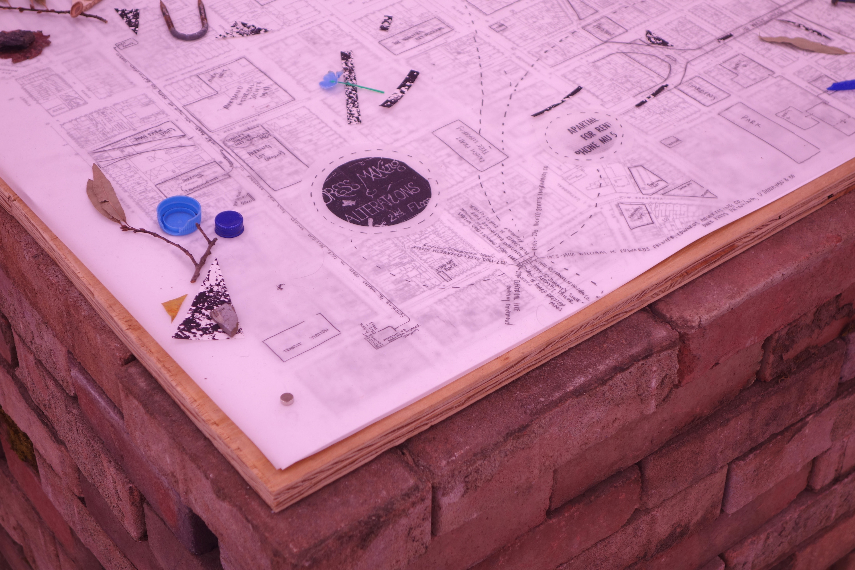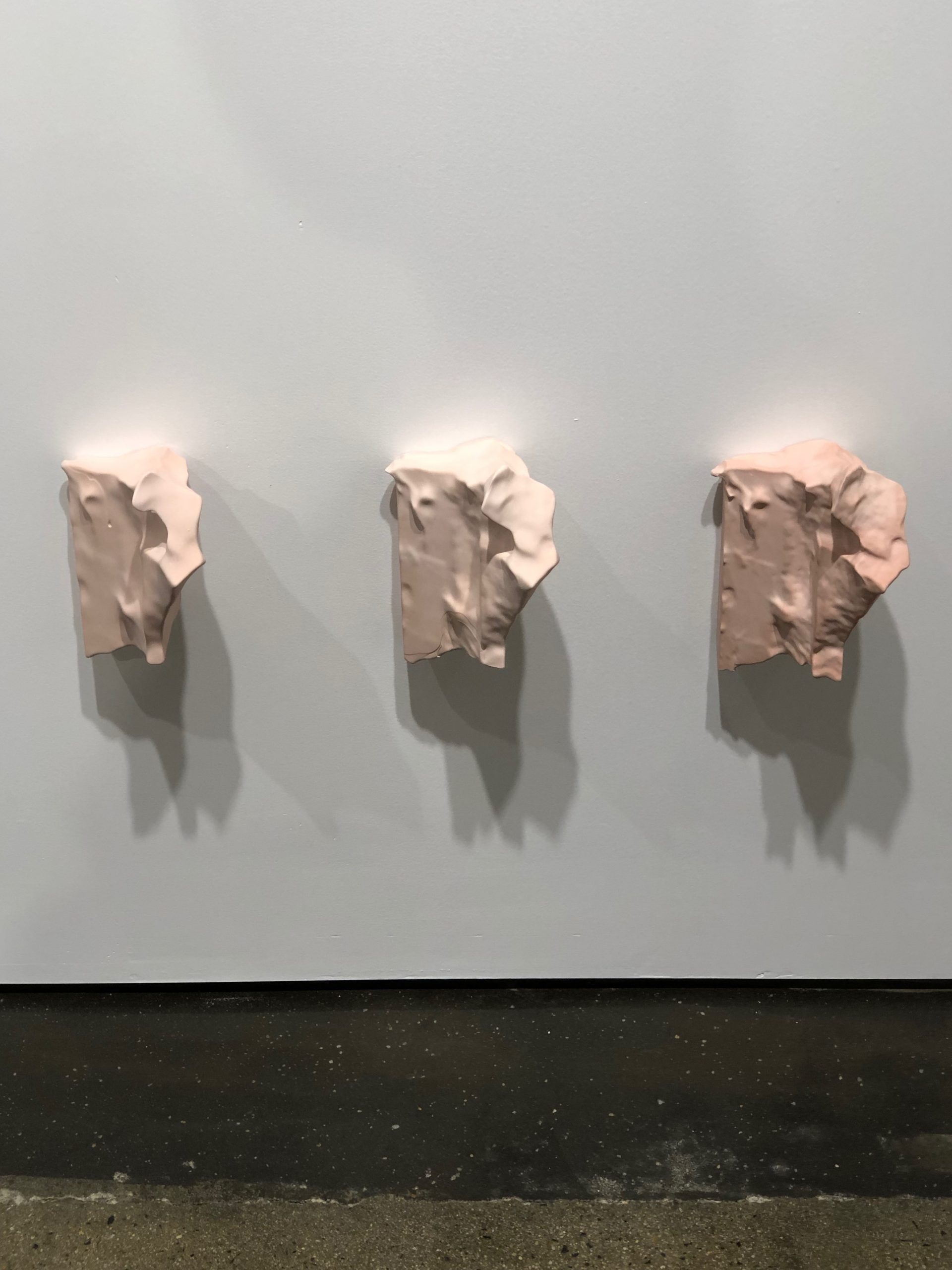 Excavating, digging, reckoning, archiving—these labors are always necessary and seem increasingly at the forefront culturally as we try to understand the present. This group exhibition, curated by MICA Curatorial Practice MFA graduate Allie Linn, offered poetic and sideways sensory explorations of a place. Lu Zhang’s vacuum-sealed food and supplies from a nearby grocery store (coffee, spices, ramen noodles, honey straws, among others) prompted questions about future disaster. Flowers that seemed to bloom from the walls in agustine zeger’s “Promised Body” referenced the beauty of nature’s quick consumption of abandoned buildings. And, the gallery itself (along with its past lives), became a crucial part of the show, bathed in a baby pink light that was so subtle in person that you could easily almost have missed it. As Rahne Alexander wrote about it in her review, “An awning for Sharp Dressed Man, a prior building tenant, still crowns the entranceway, providing a clever disguise for the gallery and serving as a readymade addition to Linn’s curatorial vision.”