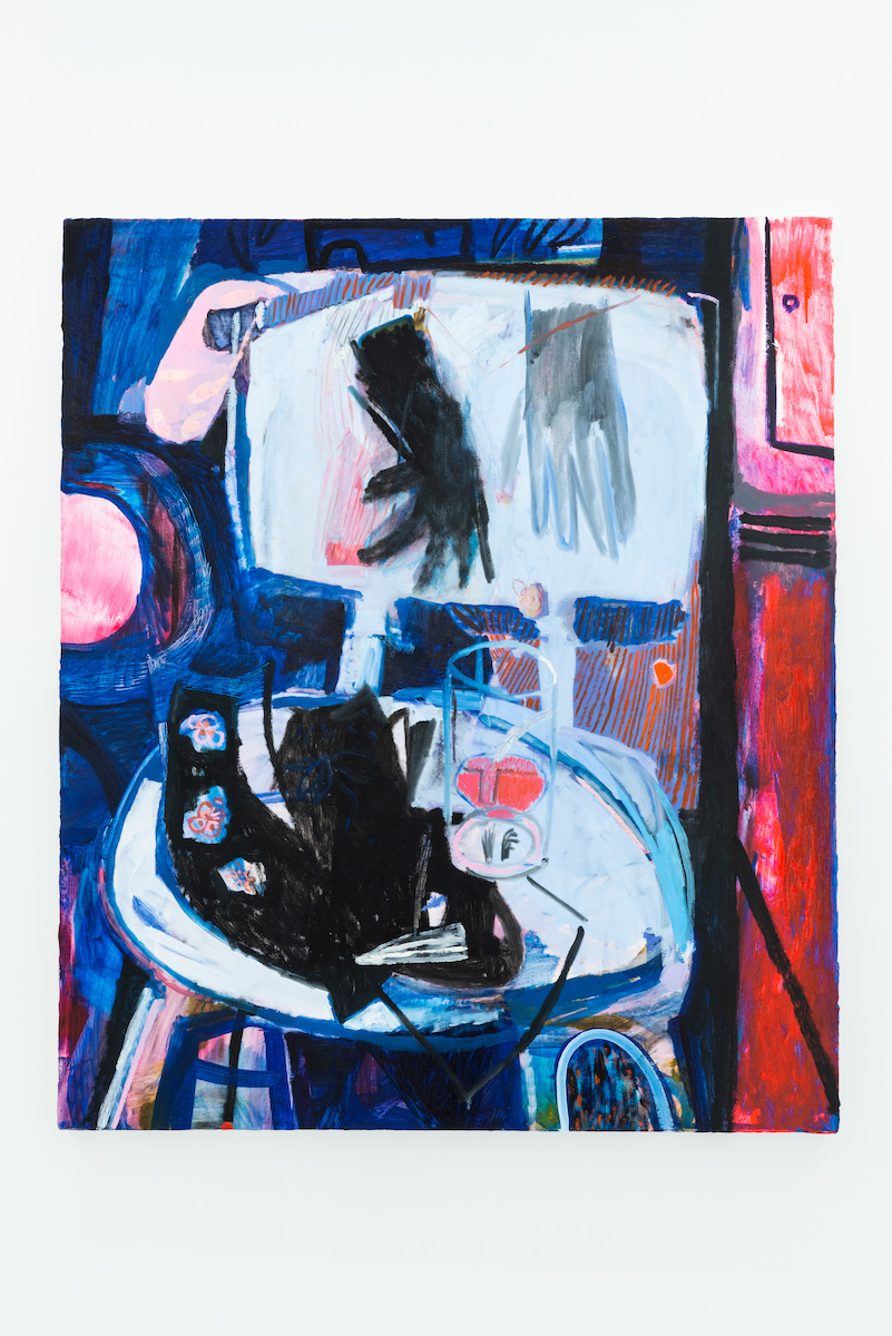 Despite an economical use of bright color, studied gestures that deceptively appear quick and free on large canvases, and apparent references to great modernist painting, Ryan Syrell’s paintings are firmly grounded in the present, toying with the backlit screens and ephemeral imagery that inform our experiences of spaces and places. In a review, Michael Anthony Farley described the experience of not simply viewing these paintings but “watching” them. Encountering the painting “Vagabond,” Farley and a friend were seduced up close by the painting’s color and strokes that guide the eye around the canvas. Stepping back, the “what” of the image started to come together for them: “’Oh wait! It’s a projector! And that’s a laptop! Wait! Are they watching porn on a projector?!’ (Embarrassingly, I’m the one who directs this question to the artist. It turns out it’s a scene from Agnes Varda’s Vagabond.)”