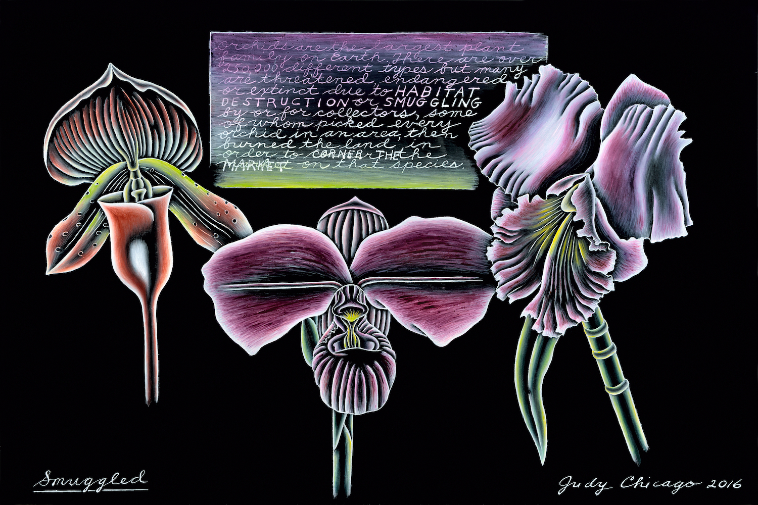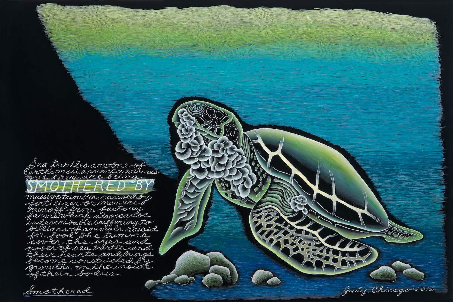 With strong fervor, Chicago alerts us of how dire everything is, her colorful depictions on black glass calling to mind velvet-painting kid crafts, or illustrations from a traumatizing picture book. Galapagos penguins are endangered by global warming and pollution; there are only 1,600 pairs of them left. Elephants, “the most caring, compassionate, and sentient beings on the planet,” are endangered due to habitat destruction and poaching, the artist writes on a panel depicting three elephants looking toward a mutilated elephant corpse. A tear streams from one elephant’s eye. The words “POACHING” and “HACKSAWS” and “MACHETES” rise up in threatening capital letters, almost stage-directing us to express shock and horror.