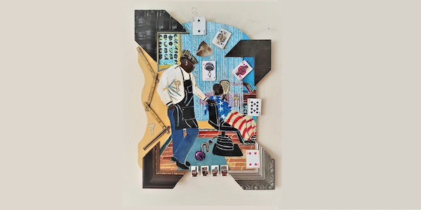 A native of Washington, DC, Cherry began making art and playing with puppets in his youth. Cherry earned a Bachelor of Arts in Painting and Puppetry from the University of Michigan, a Master’s degree in Museum Education from The George Washington University, and a Doctorate in Museum Education from Columbia University. Cherry’s works are informed by a broad sweep of narratives, literature, mythology, music, current events, and steep in United States history. Although his preferred medium is acrylic with found objects on wood, audiences will find familiar items such as keys and locks, as well as cultural identifiers like cowrie shells in his creations.
