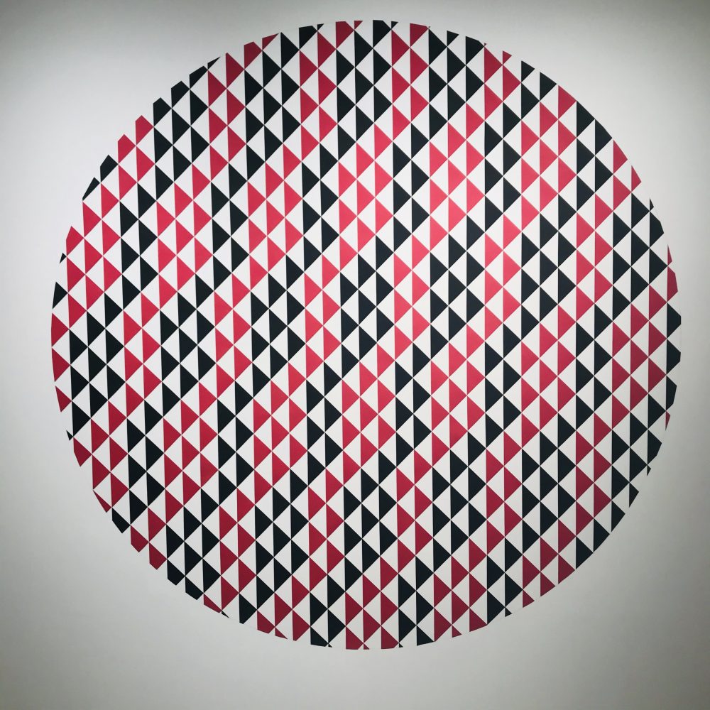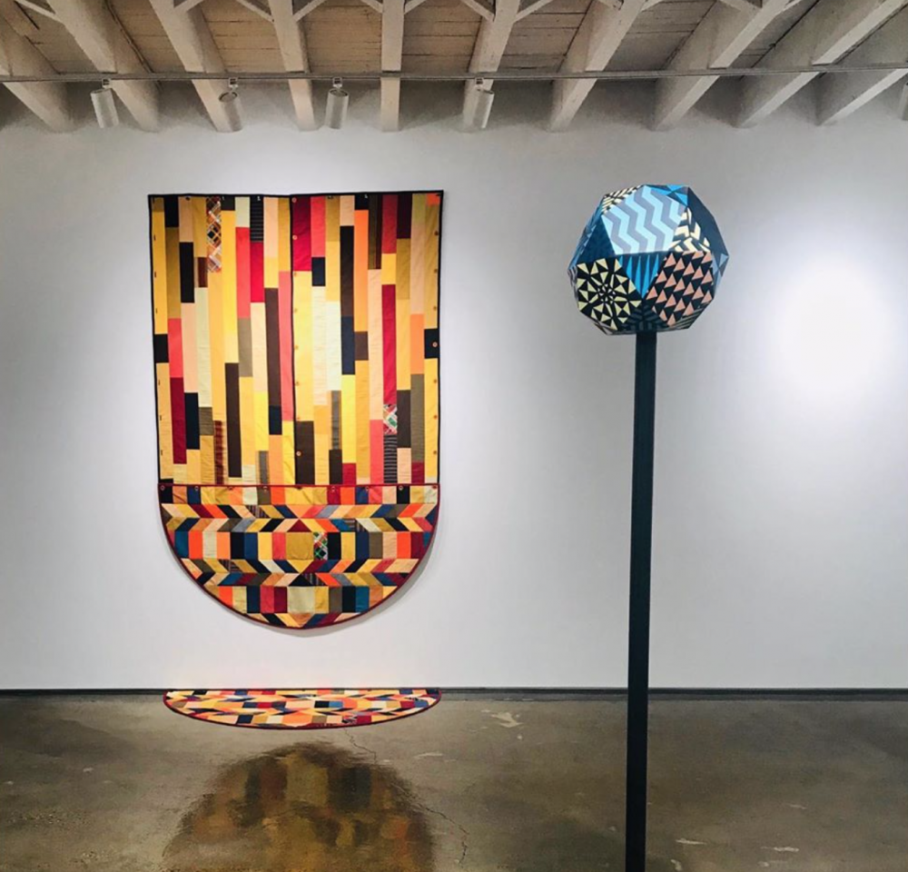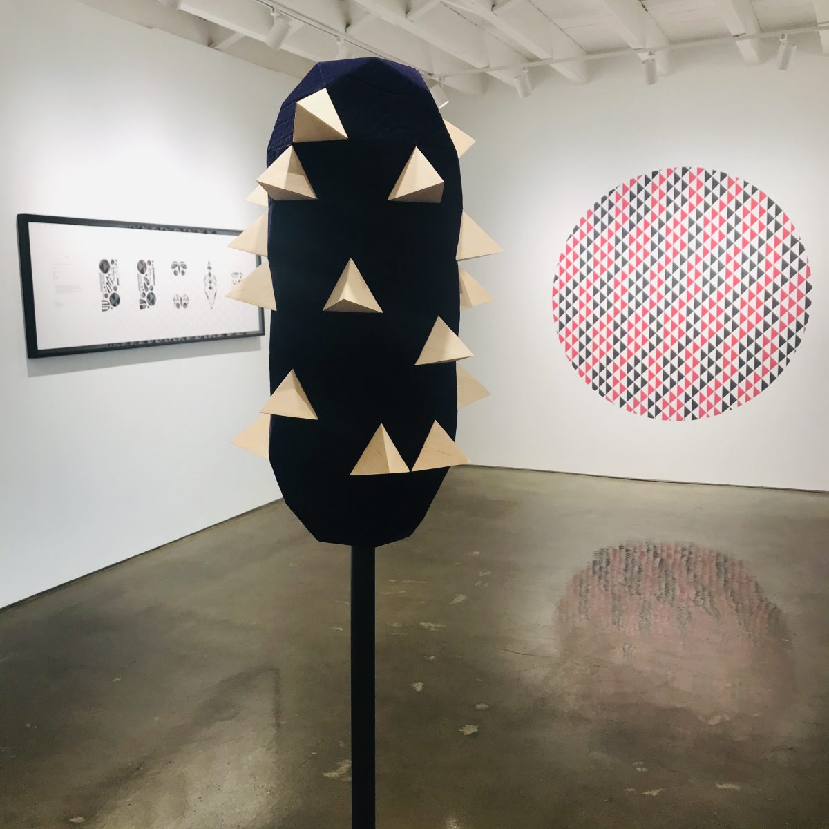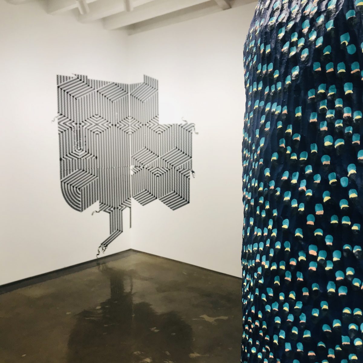 An equally compelling piece, Patricia Zarate’s wall installation of black and red triangles is arranged in a 72” circle directly on the wall, functioning simultaneously as a mandala, paper quilt, and mural. This hybrid piece commands your attention from a distance through bold color and intricacy, offering a dizzying arrangement that, up close, is surprisingly tender and intimate. Instead of erasing it, the artist left a simple pencil line on the wall where she drew a perfect circle to orient the complicated grid of shapes. This evidence of the artist’s process, although arguably an imperfection, charmingly humanized this work that from a distance seems mechanically precise. Titled “Tri-modulation” (2020), it feels simultaneously digital and handmade, complex and simple, and its visual oomph is achieved through devotion and accumulation.