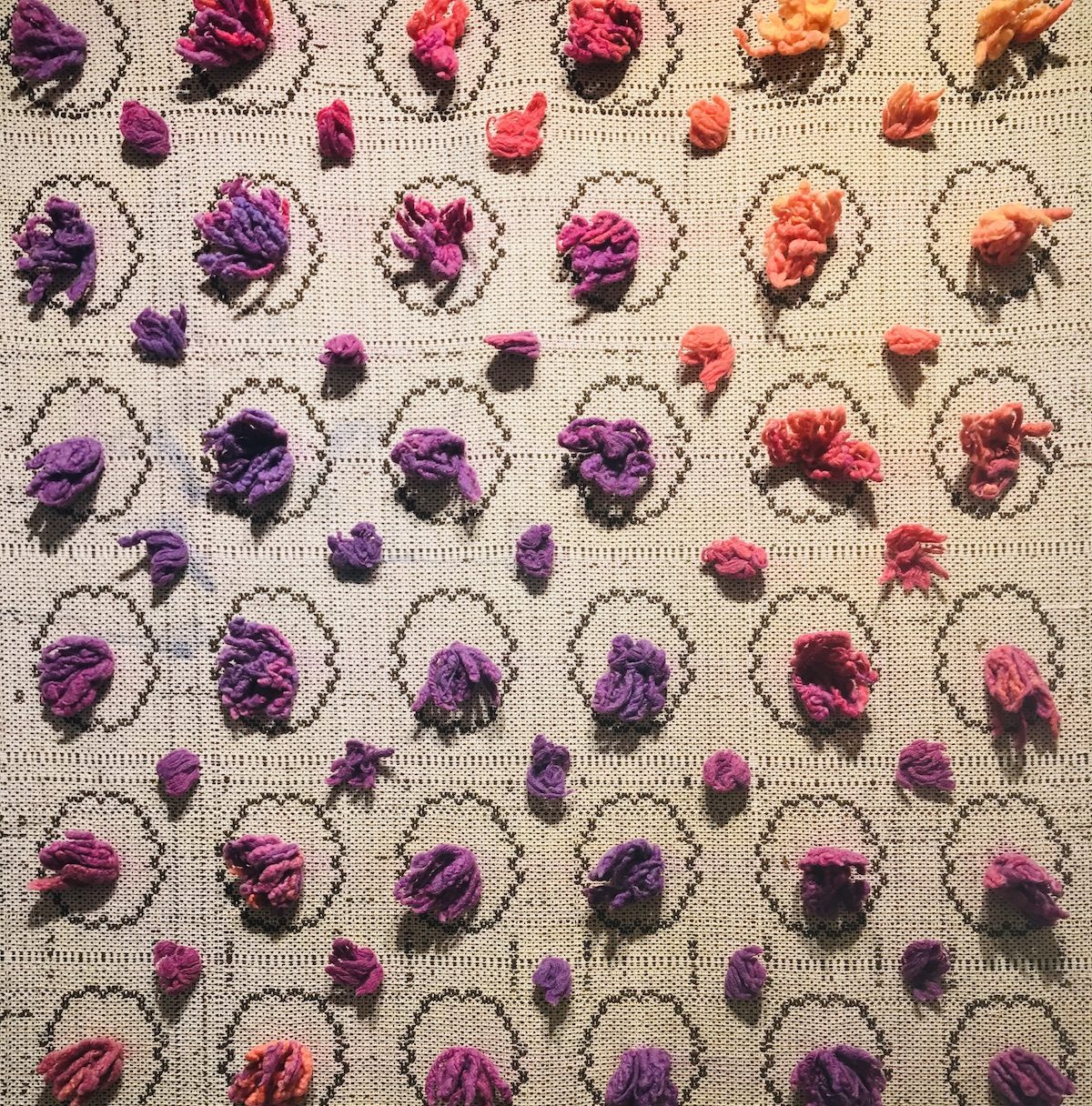 Three totemic sculptures by Sarah Bednarek function as odd and solemn memorials, a testament to the healing properties of repetition, symmetry, intricacy, and humor. Bednarek died last year at age 39, and her physically beautiful, decadently colored sculptures vibrate with an eccentric but sincere brand of molecular humor achieved through the homey medium of painted wood and, in one case, velvet. All four resemble microscopic organisms and cells, and offer a macro/micro view of the universe and a solid respect for the finality of life. It was these works in particular that made me wonder if pattern’s never-ending potential to proliferate is, in fact, a very human reaction to the mortality we all share and a way to feel connected to something larger and universal which will outlast our existence.