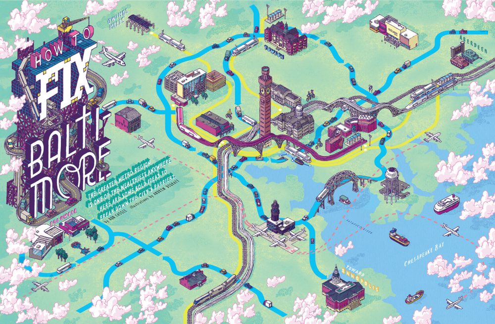 Over the next six pages, we look at 12 bold ideas to move Baltimore forward in the 21st century after decades of segregation, isolation, and stagnation. Some are successfully employed elsewhere, some are new, and several are being explored. One worked here before. The overarching theme is Baltimore will remain stuck in place until its internal physical barriers and its city line—a de facto border wall—are torn down.
