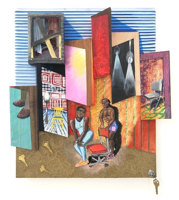 Devin N. Morris, You Close Doors Yet Windows Are The Threshold And Neither Are A Concern of Recent. Did You Notice?, 2019, Acrylic, collage, oil pastel, wood veneer, metal key shavings, metal house keys, photo collage, leather, watercolor and velvet ribbon on wood panel, 22.5 x 23.5 x 5 in.