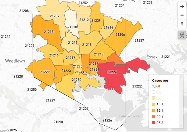 Header image: Infection rates (cases per 1,000) by ZIP code, as of July 9, underscore the high rate in southeast Baltimore. (coronavirus.baltimorecity.gov)