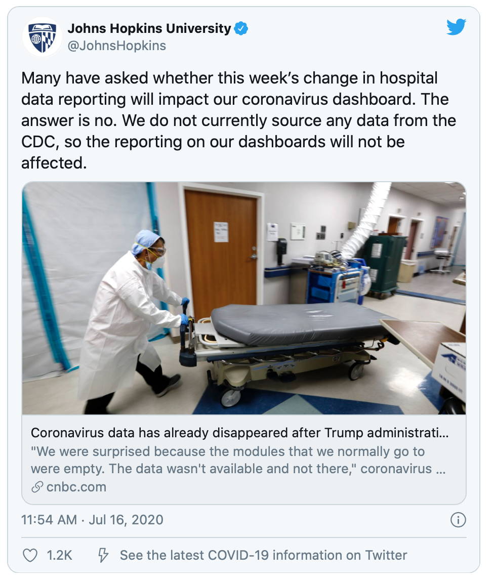 On Wednesday, the path that data travels came under scrutiny, as The New York Times reported that the Trump administration ordered hospitals to sidestep the Centers for Disease Control and instead send information on hospital beds and intensive care unit capacity to a database run by the U.S. Department of Health and Human Services, which oversees the CDC and has politically appointed leadership. By Thursday morning, the data was already gone from the CDC’s source, Ryan Panchadsaram of data tracking site Covid Exit Strategy told CNBC.