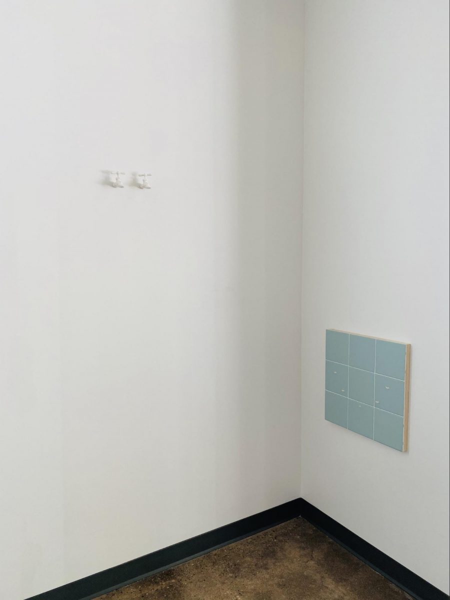 Installation view of “Concept+Context.” Foreground: Elliot Doughtie, Venus As A Boy, Wood, tile, gypsum, plaster, resin, copper pipe, epoxy putty, Buck Off TM, glass vial, cottonseed oil, testosterone, and fox fang, 2020