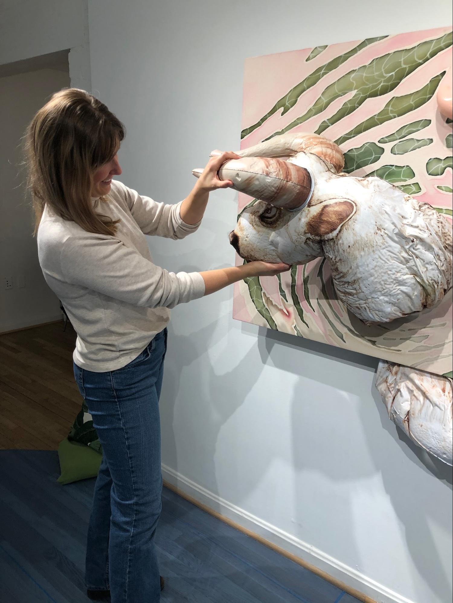 They’re almost more sculpture than painting now as a result, so they have to be treated as such. I’m a painter who decided, you know… how do I make paintings more difficult to transport? Let’s try that! It’s a process, attaching and stitching the floats in. By the end, my fingers were raw from using upholstery curved needles. But I’m happy with where this series is going and feel like the use of these plastic elements adds a lot.