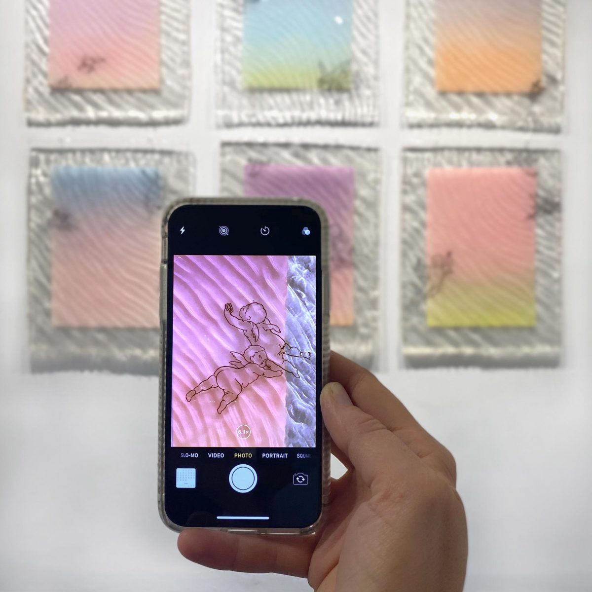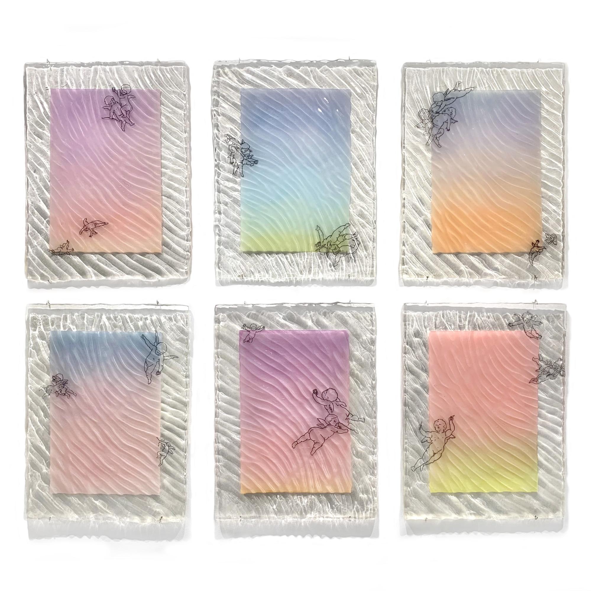I feel like I really address this idea in Sunsets No.1-6. I wanted to explore a different way of conserving works, so instead of making pieces that were buoyant, I made some that can sink and be archeologically found at a later date, protected like a dragonfly in amber. I started by painting these overly radiant sunset scenes inhabited by transparent ink drawings of putti. Then I encased them all in rippled eco-resin which resembles the surface of water and refracts the ambient light in this really awesome way. These putti function as personifications of our naivety and the baser activities we engage in to distract ourselves, so you see some of them with cell phones taking selfies or sort of wrestling to surveil and film each other while others chase flocking money emojis.